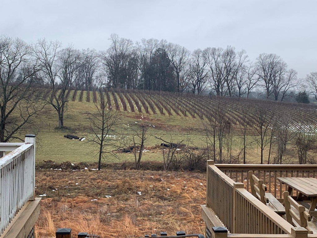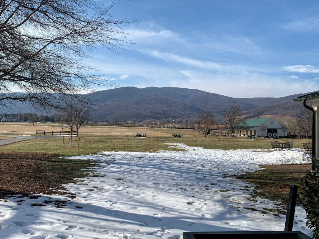 Our first wine stop was King Family Vineyards in Crozet, VA. The facilities are expansive, with multiple buildings and both indoor and outside seating, including gas firepits that were getting good use on this chilly day. In the summer they host polo matches. The classic tasting is $12.00 which includes four varieties that you select. I tried the Chardonnay, the dry Rose, the Cabernet Franc, and the Meritage red Blend. We had picked up salads at local favorite Ivy Provisions in Charlottesville and tasted the wines along with our lunch. They were all good, but nothing inspired me enough to buy. So much about what influences perception of wine are other things than the wet stuff in the cup, things like the setting and what you are eating. I suspect if we were sitting in a lawn chair with friends sipping rose, snacking on a cheese platter, and watching a polo match I would have a very different opinion. The braised apple, goat cheese and arugula salad was tasty, but it didn’t do the wine any favors. We will just have to go back!