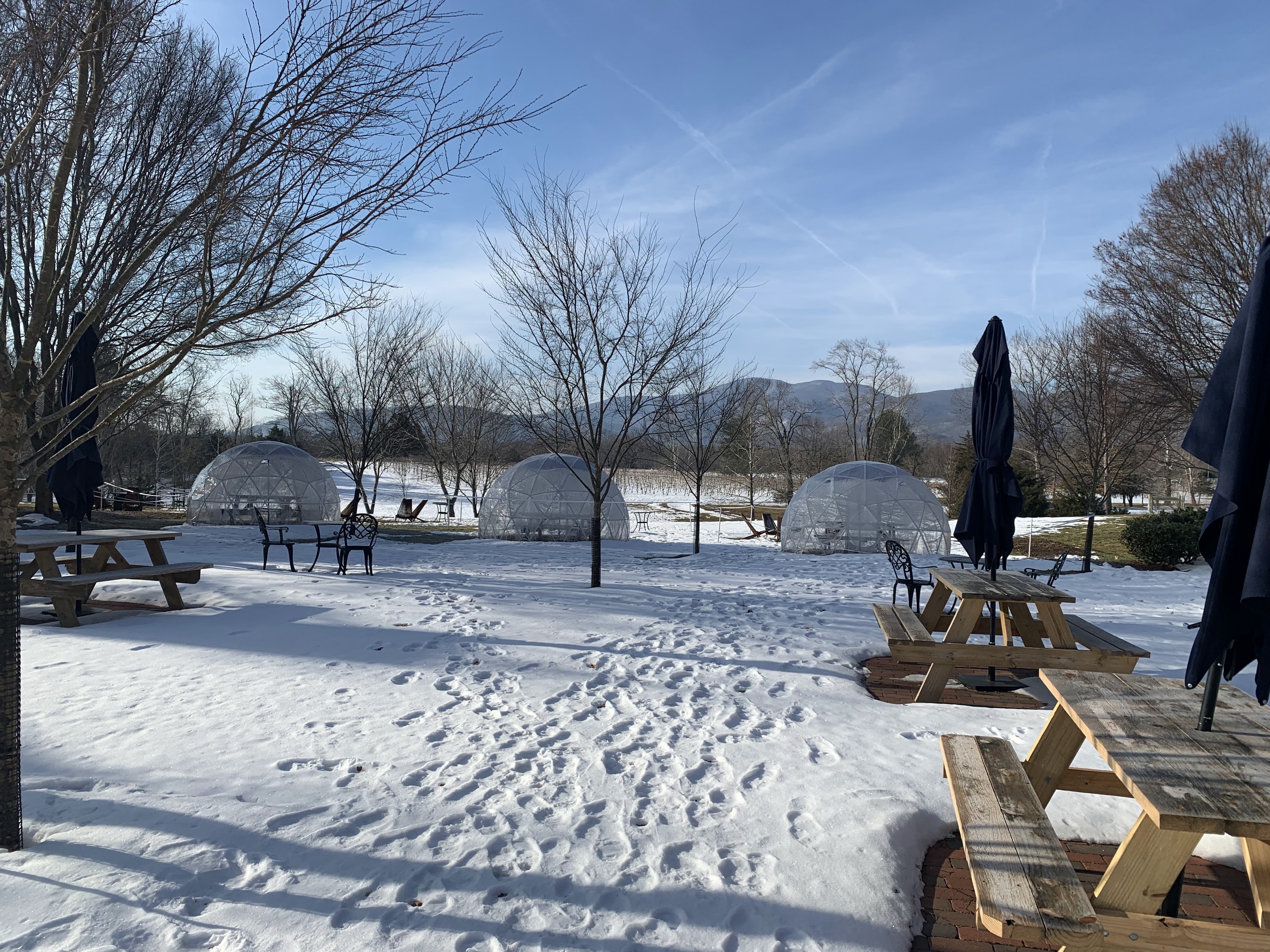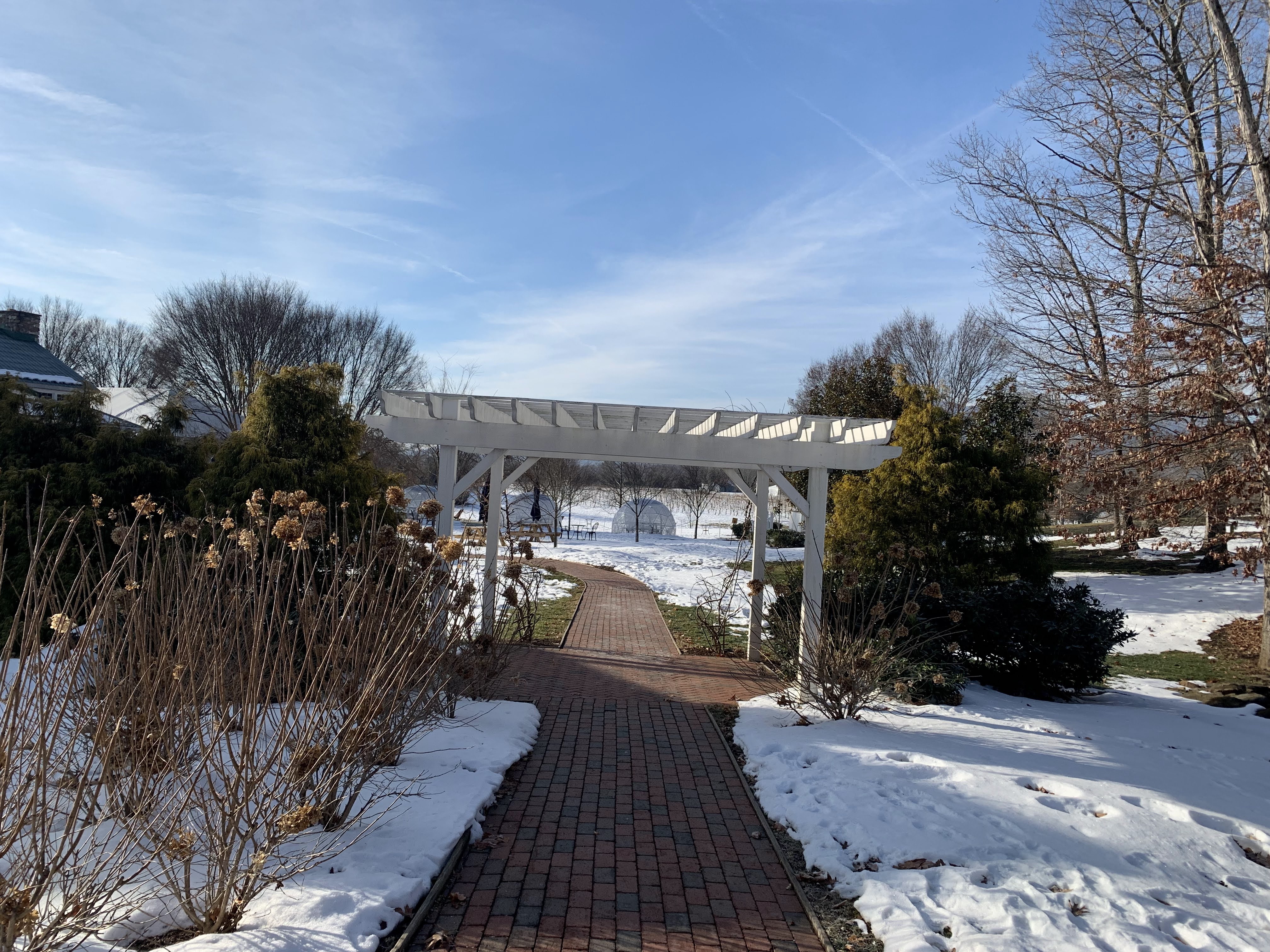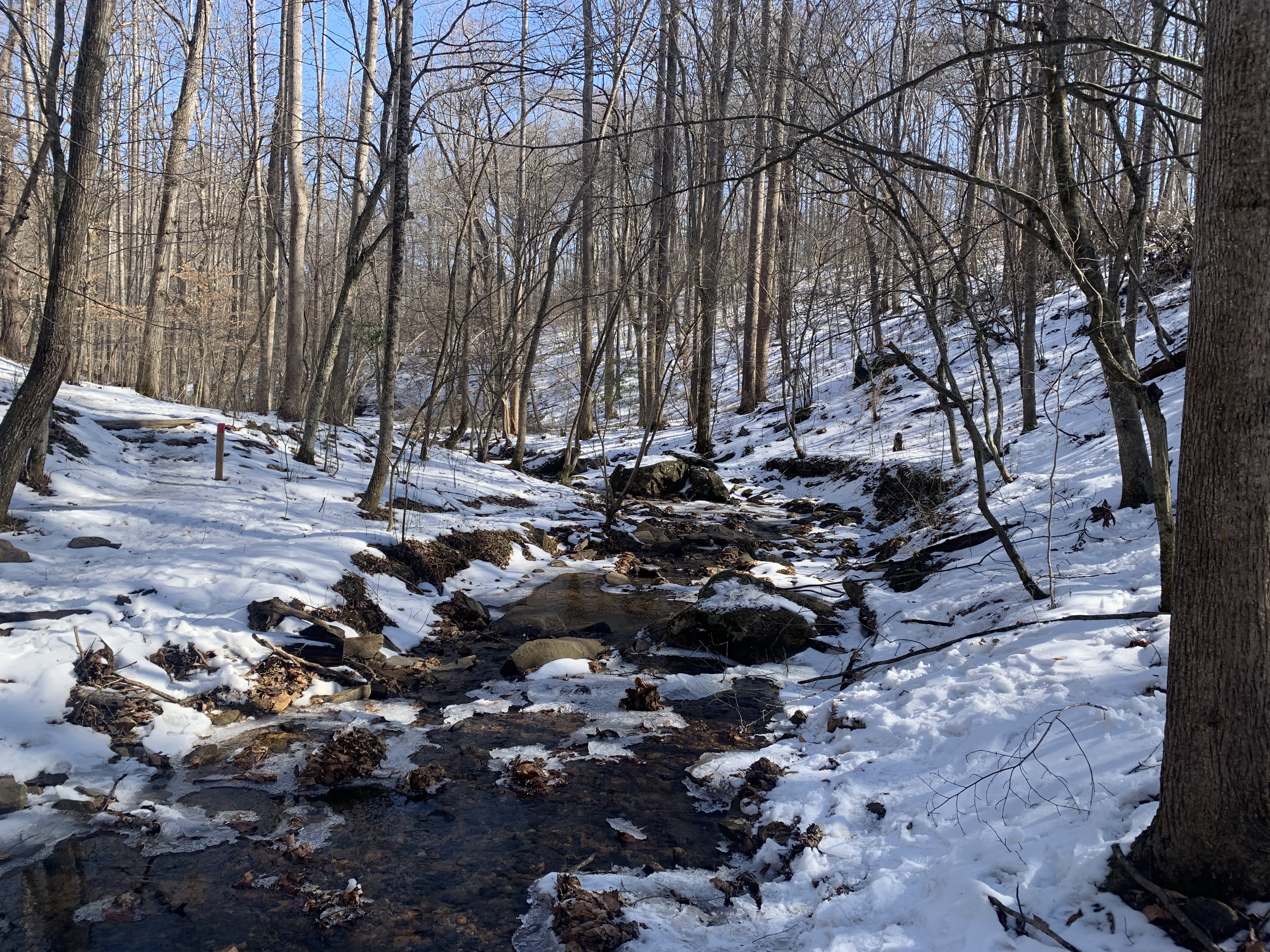 To prepare for the wine trail, we needed to find one of the other trail variety to burn off some calories from the previous evening’s dinner. But due to Problem # 1 discussed in the “Virginia” post, most of the obvious hiking spots were closed. Our friend Google found the Ivy Creek Natural Area just north of town. We walked a few different trails and logged a few miles, mostly in the snow (glad we brought the hiking boots). It was not so bad, there was only a few inches snow and it made for gorgeous views.