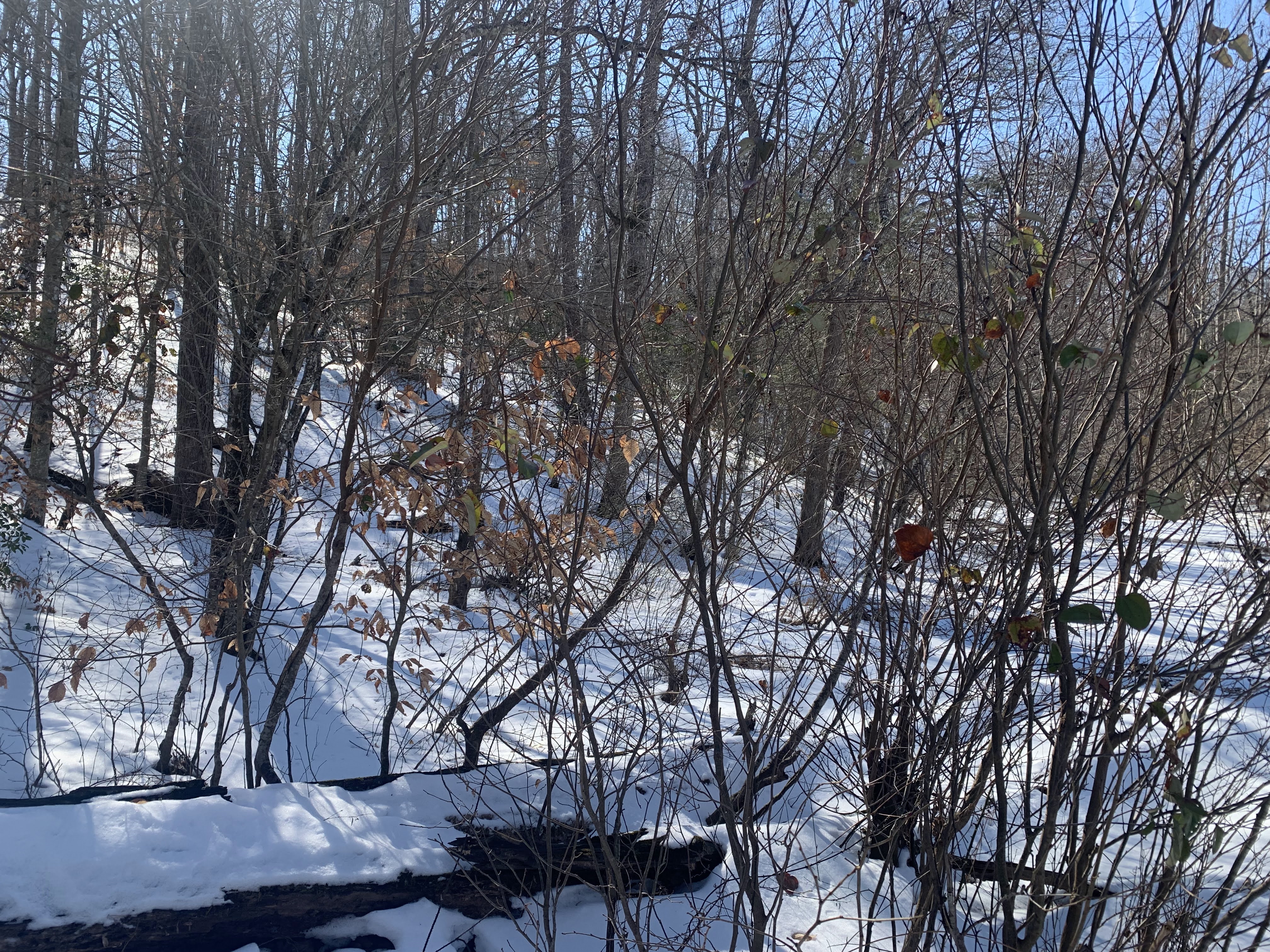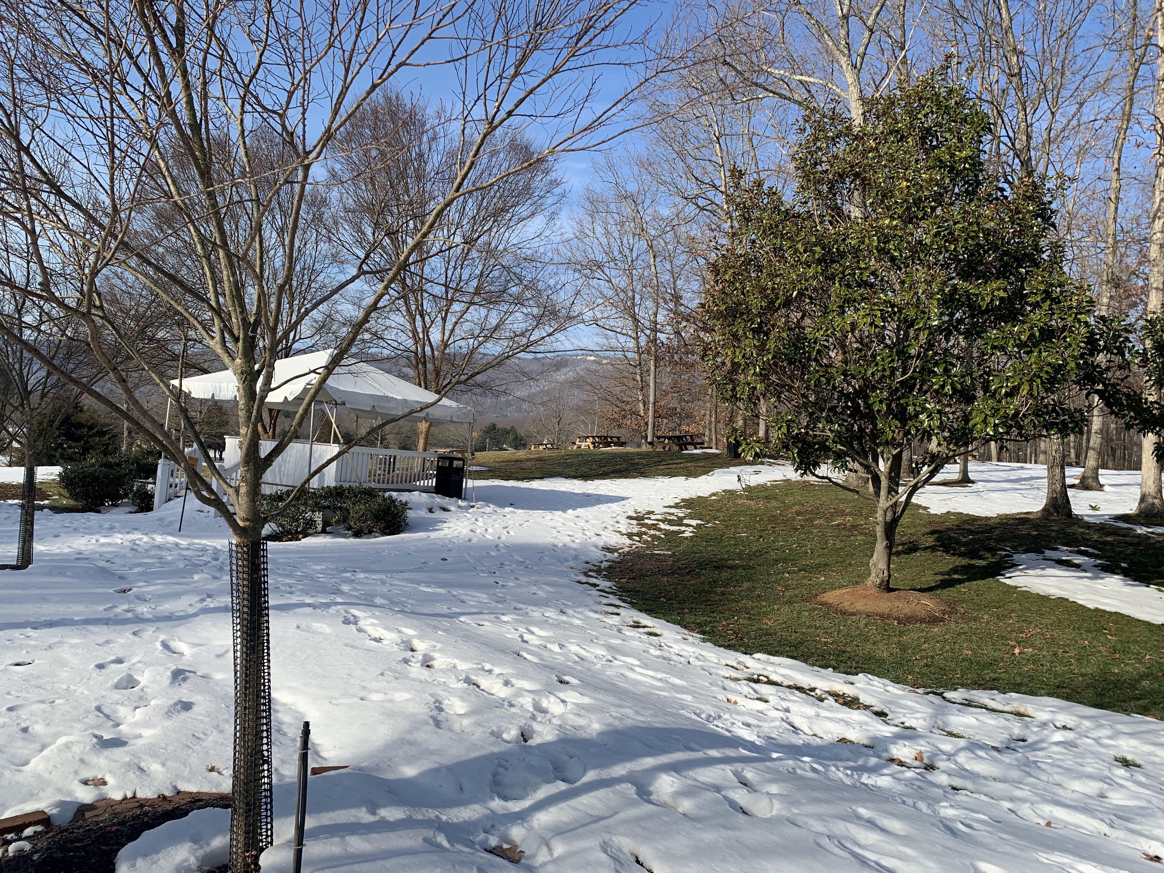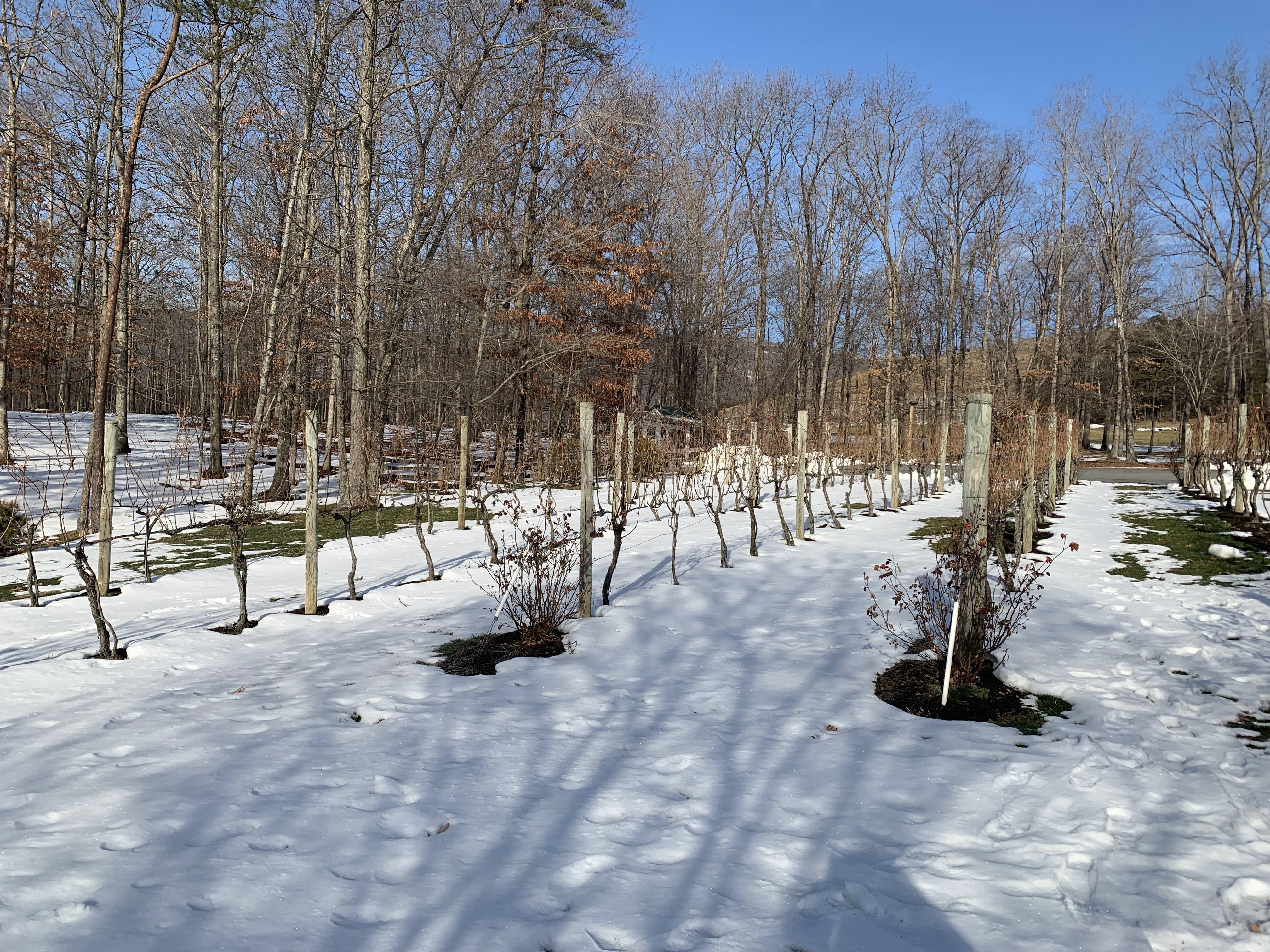 To prepare for the wine trail, we needed to find one of the other trail variety to burn off some calories from the previous evening’s dinner. But due to Problem # 1 discussed in the “Virginia” post, most of the obvious hiking spots were closed. Our friend Google found the Ivy Creek Natural Area just north of town. We walked a few different trails and logged a few miles, mostly in the snow (glad we brought the hiking boots). It was not so bad, there was only a few inches snow and it made for gorgeous views.
