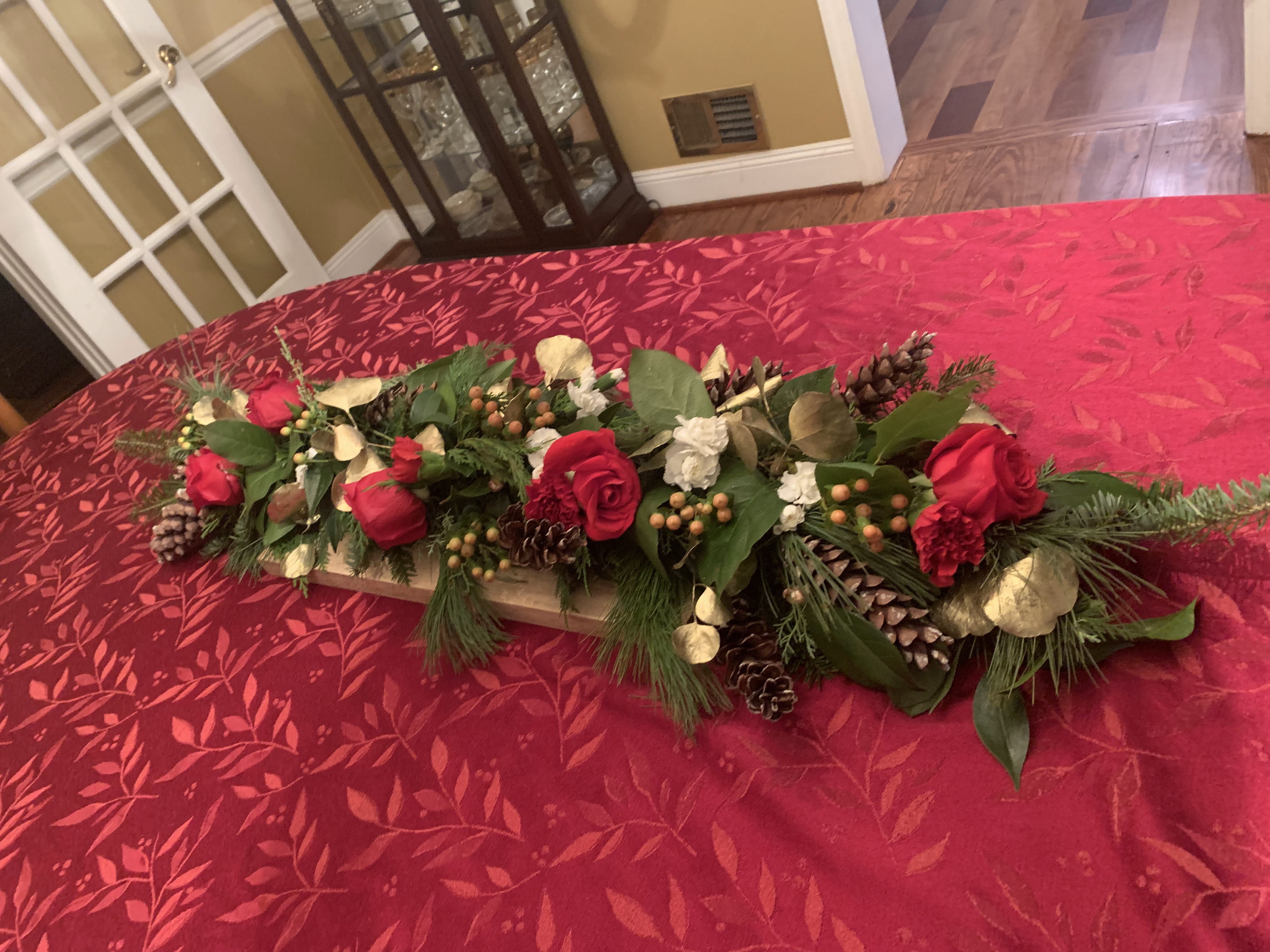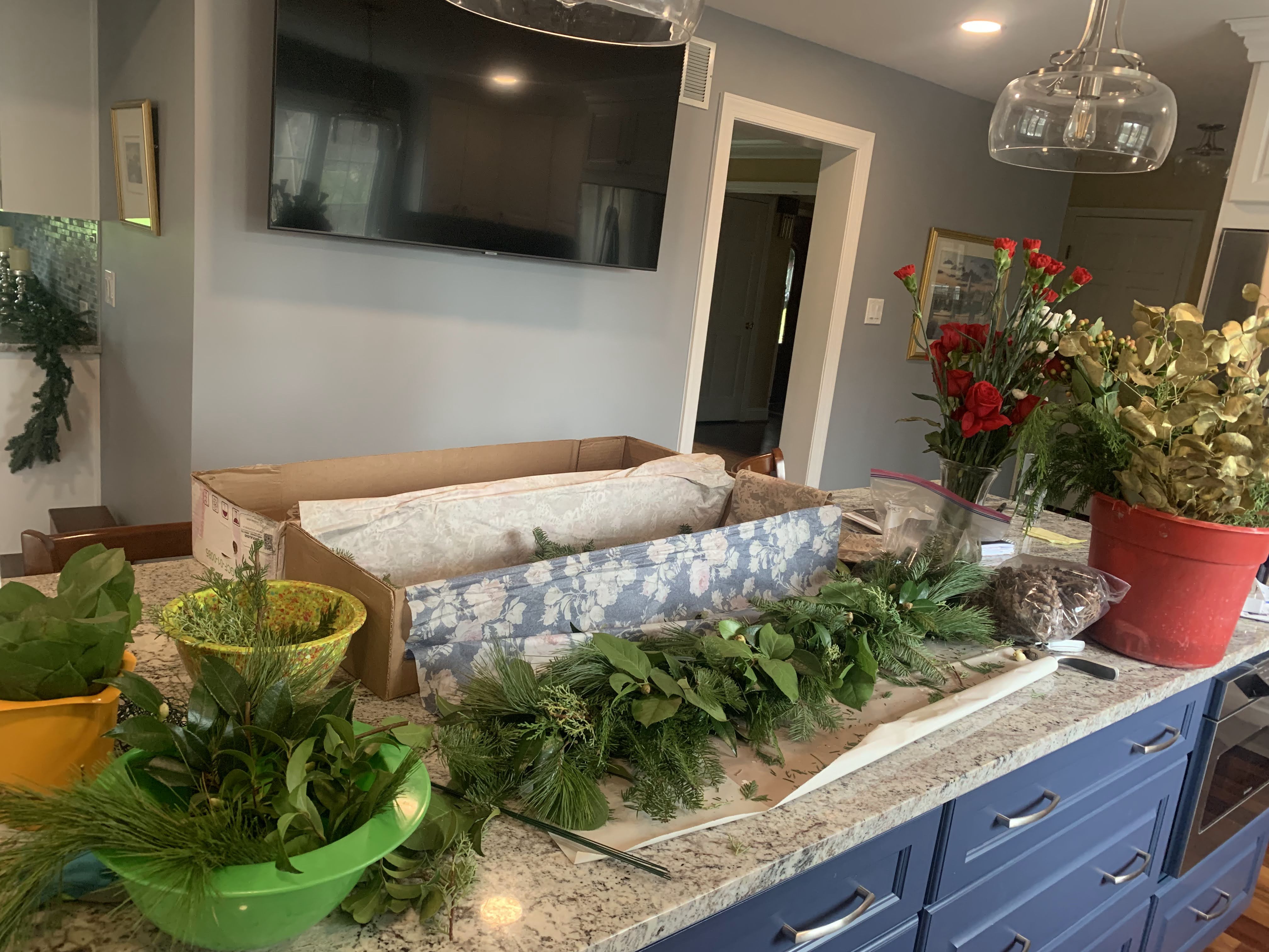 Now we will move on to overcoming cluelessness. I like flowers but doing anything with them other than shoving a bunch in a vase was beyond my ability. At Christmas time I saw a class in one of Gardens’ regular emails that looked like fun. I love the greenery garlands you see at Longwood and other holiday displays. Doing one of those seemed feasible, after all greenery is pretty indestructible compared to flowers. It was virtual, life over zoom so you could ask questions like “please do that again”, “does this look right” and after the class you could access the video for a while. That provided the security that if I messed up on class day I could re-watch it and figure it out. So, I signed up. A day or two before the class date a giant Fed-Ex box arrived with all the materials. A lot of materials. The class itself was a revelation- make a chicken wire cage, water in floral tubes, wiring stuff in place. I learned several techniques that I did not know existed, no way would I have figured this out on my own. Below you can see the materials and the results.