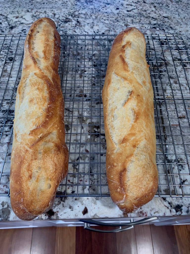 I have been baking bread for years but am by no means an expert. While I usually manage to produce a decently tasty loaf, things do not always go the way the recipe sounds like it should. There are loads of YouTube videos out there, but that does not help when something is not working, and you don’t know why or what to do about it. The recipe says do this until the dough is well mixed or shows strength. Well, it’s just lying there. Is it supposed to be running laps around the kitchen? Bench pressing the bowl? But where to go for help? If you bake at all you have seen King Arthur Flour in your grocery store. It is a good product and their website has lots of great recipes, how to videos and they sell every baking tool, pan, gadget and ingredient you can imagine. They also have a well-regarded baking school with classes for every level from beginner through professional. I have always wanted to go. When Covid restrictions called a halt to in person teaching they moved online, which worked so well that even with the resumption of in person classes they have a full calendar of Live online classes. When my beloved spouse was looking for Christmas gift ideas, I suggested he sign me up for a baguette class.