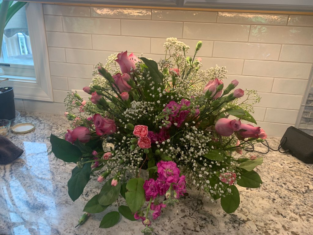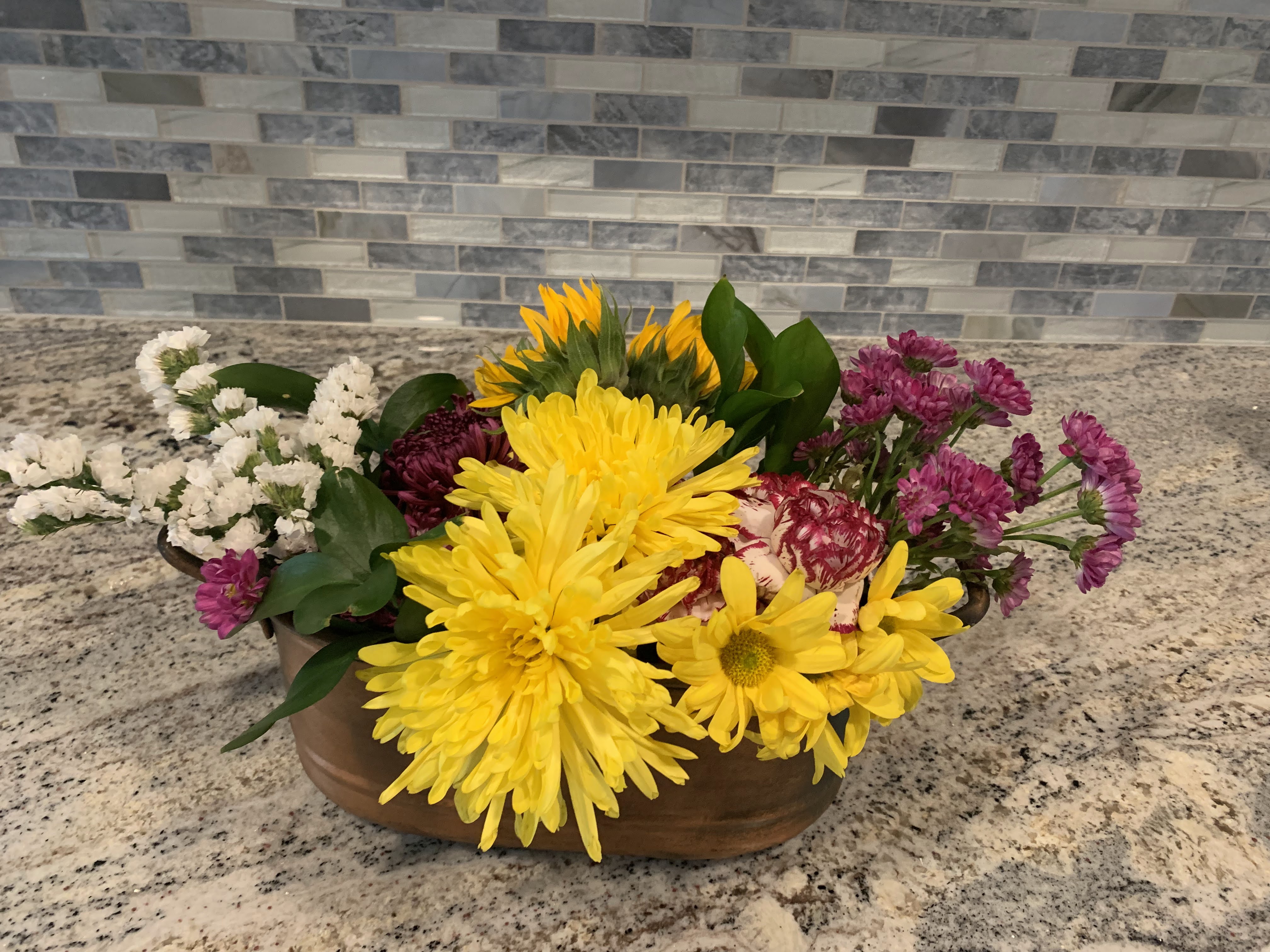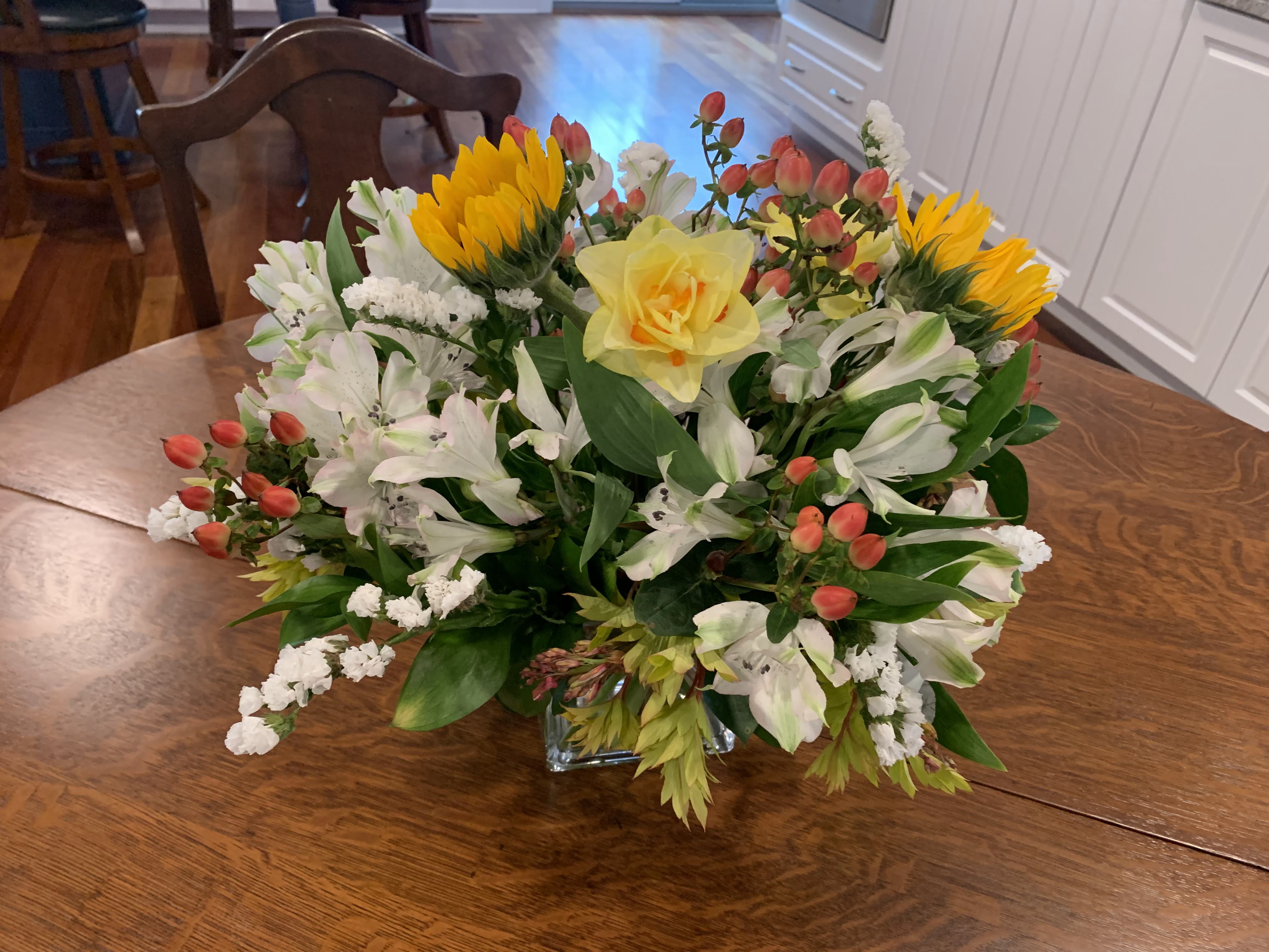 So I signed up for the completely virtual, Floral Design Basics. It is self-paced; with video and static presentation modules you complete at your own pace. This was a bit harder than the live session. There is no way to ask questions and it has been hard to locate some of the floral materials. Each module goes though a type of design, explains the types of flowers, foliage, mechanics and so on then concludes with an “assignment”. The “recipe” gives a list of flowers (with photos), foliage, containers, and other supplies. It describes alternatives, so if you cannot find sunflowers it lists a few alternatives. Locating the flowers and foliage called for in the “recipes” was problematic earlier in the year. The course instructions say that you can post questions on a discussion board and while several people asked where to obtain materials, no useful information was posted in reply. The arrival of Spring flowers in the markets, especially leading up to Easter improved supply immensely.