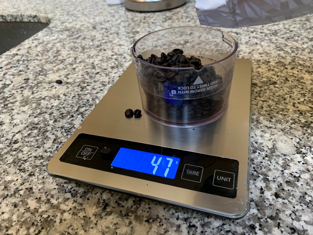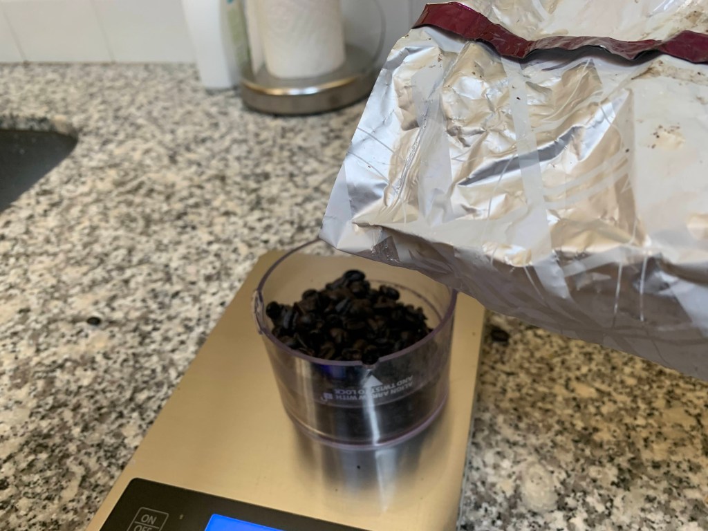 For what else can you use a scale? I measure the beans for coffee on mine before I dump them in the grinder. Remember the weird obsessive thing? I worked for Maxwell House coffee, way before Starbucks introduced the world to $5.00 coffee that takes 10 words to order. People drank Maxwell House or archrival Folgers, based on which brand was on sale or had the biggest coupon. The coffee buyers said that the beans used in these brands were crap, Europeans would not feed them to the pigs. In the office we drank Yuban, a Maxwell House brand that was as good as it got at the time. I remember noticing that I really liked the coffee at a French restaurant, wow, this tastes so much better than what I was used to; and for the first time I understood what the coffee geeks were talking about. French Roast coffee was just not a thing in the early 80’s. So why do I weigh the beans? That is what they do at geeky coffee places. Different roasts and beans have varying densities, so they weigh to get a consistent taste. Do you care? Back in the 80’s a product research firm did a blind tasting study which showed that most people could not tell the difference between instant coffee and ground, much less more subtle distinctions. But a lot more people smoked then too. But I digress. I noticed that sometimes the coffee I made came out good (or how I like it anyway) and sometimes not so fantastic despite using the same beans and same water. I looked up recommended ratios and played around with it from there. And again- it is easier to dump beans into a cup than use a spoon- level or rounded, wait was that 5 TB or 6??? Way too much work.