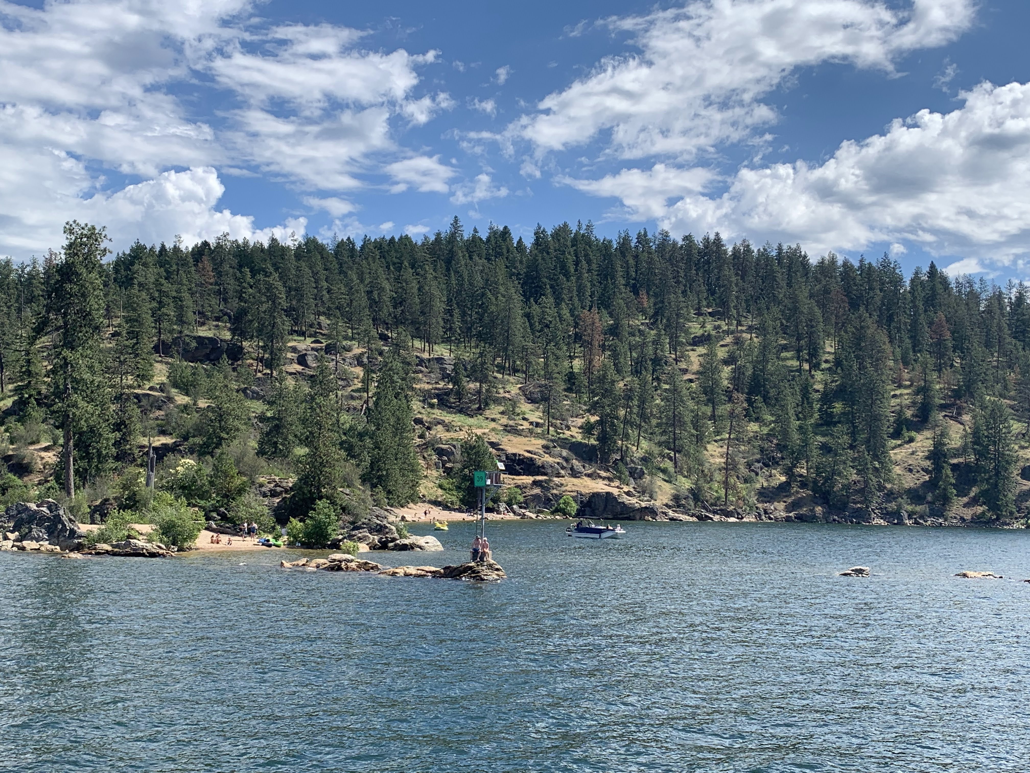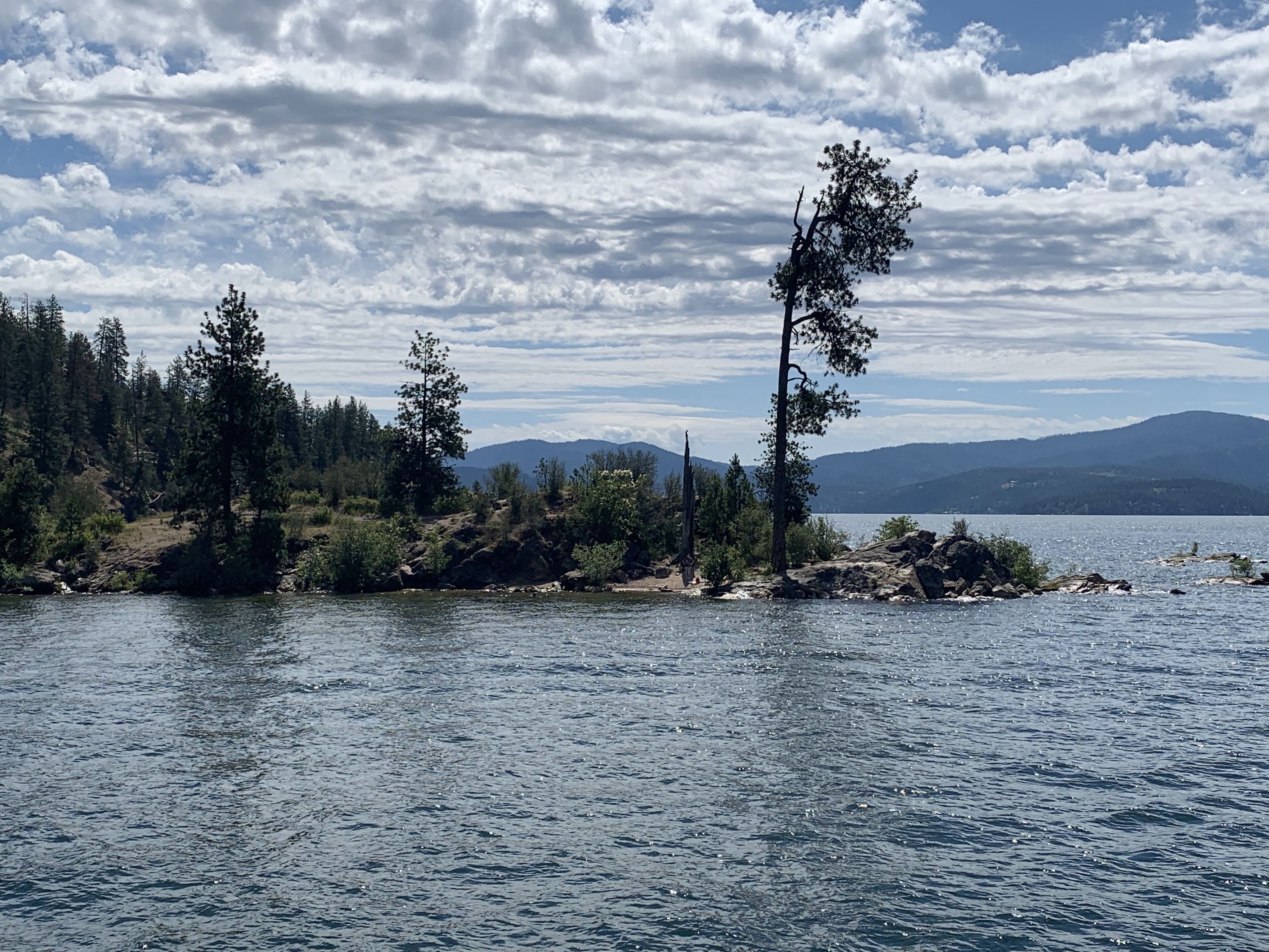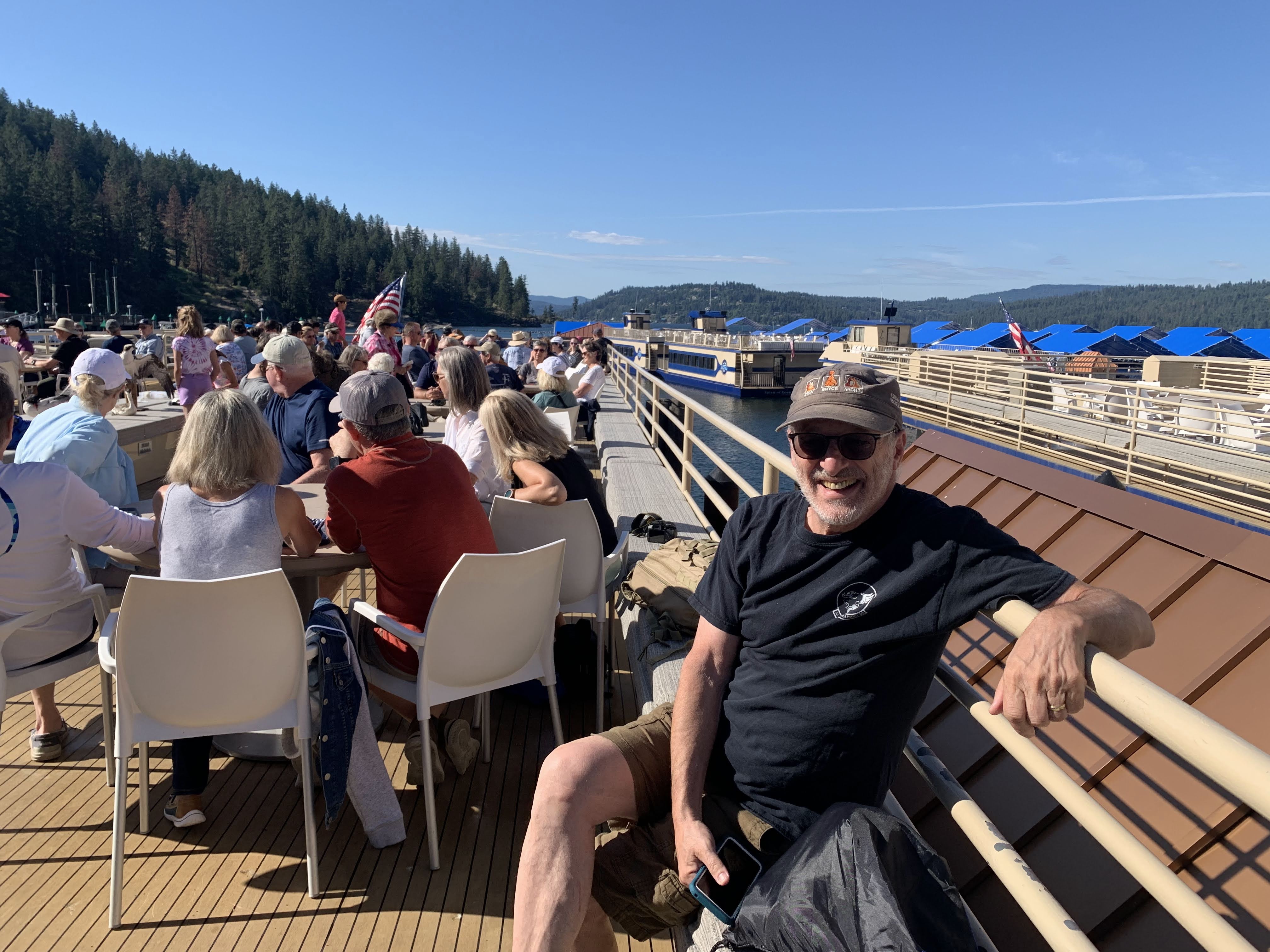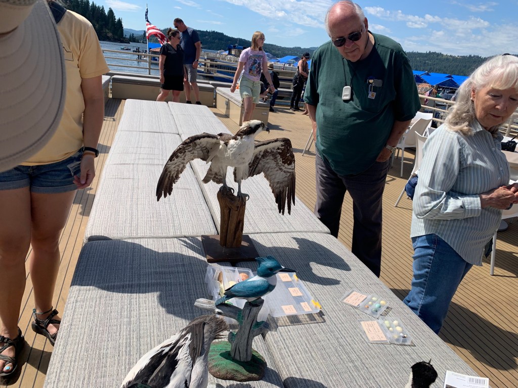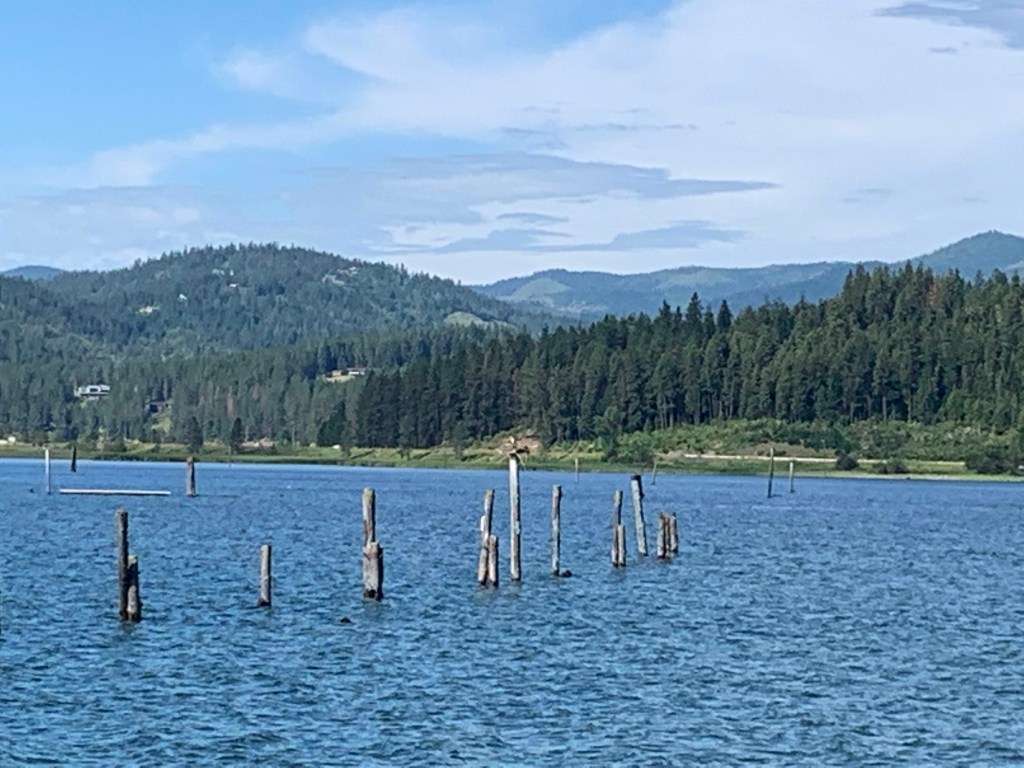 It’s been beautiful in northern Idaho, nothing like last year’s weird 100 plus degrees and record low lake levels. Today was a chamber of commerce day, literally, because we went on the Coeur d’Alene Chamber’s annual Osprey cruise. It is exactly what it wounds like. You get on one of the big tour boats that leave from the marina at the Coeur d’Alene Resort, a few naturalists talk about the various water birds, ospreys, bald eagles, tundra swans, wood ducks etc. as the boat cruises around their nesting and fishing spots. Ospreys are easy to spot because they nest on exposed piers and pilings, bald eagles hide their nests, so they are more elusive. We also learned about the water quality and history of the lake. Coeur d’Alene, like the little lake we are on and the gigantic Lake Pend Oreille to the north, are all glacial lakes which were enlarged and stabilized by dams in the early part of the 20th century. The Coeur d’Alene River flows down from the Silver Valley into the lake and the Spokane River flows out. By products from mining the Silver Valley, where more silver has been extracted than anywhere else on the planet, have left lead deposits in parts of the lakebed. Wealth flowing from those mines fueled development of western cities like Spokane; the river that gave the city its same was home to numerous sawmills that used parts of lake Coeur d’Alene as holding areas for logs before they were floated into the mills. The remains of one of these now host Osprey nests and preserved areas for wildlife.