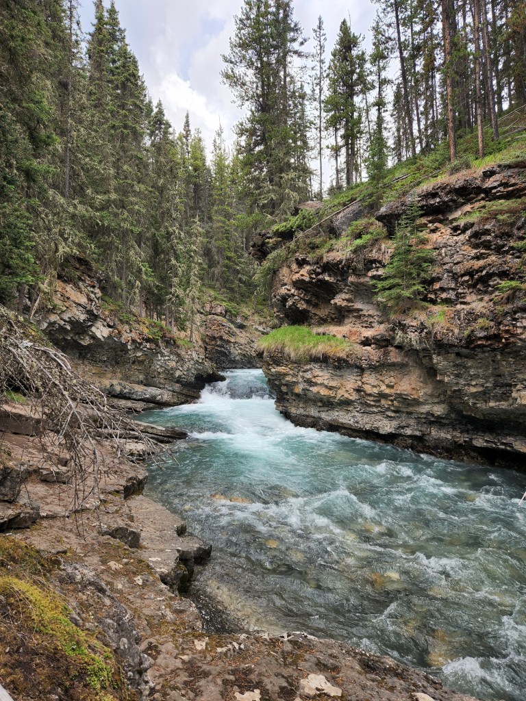 We arrived in Canmore after a lovely 6 ½ hour drive through the mountains. Priority one for our first full day was getting the slow leak in a tire fixed. We were able to make a late afternoon appointment, pumped it full and headed off to the park to hike Johnston Canyon. This is a popular trail, but a good percentage of hikers don’t go past the Lower Falls to the Upper Falls.