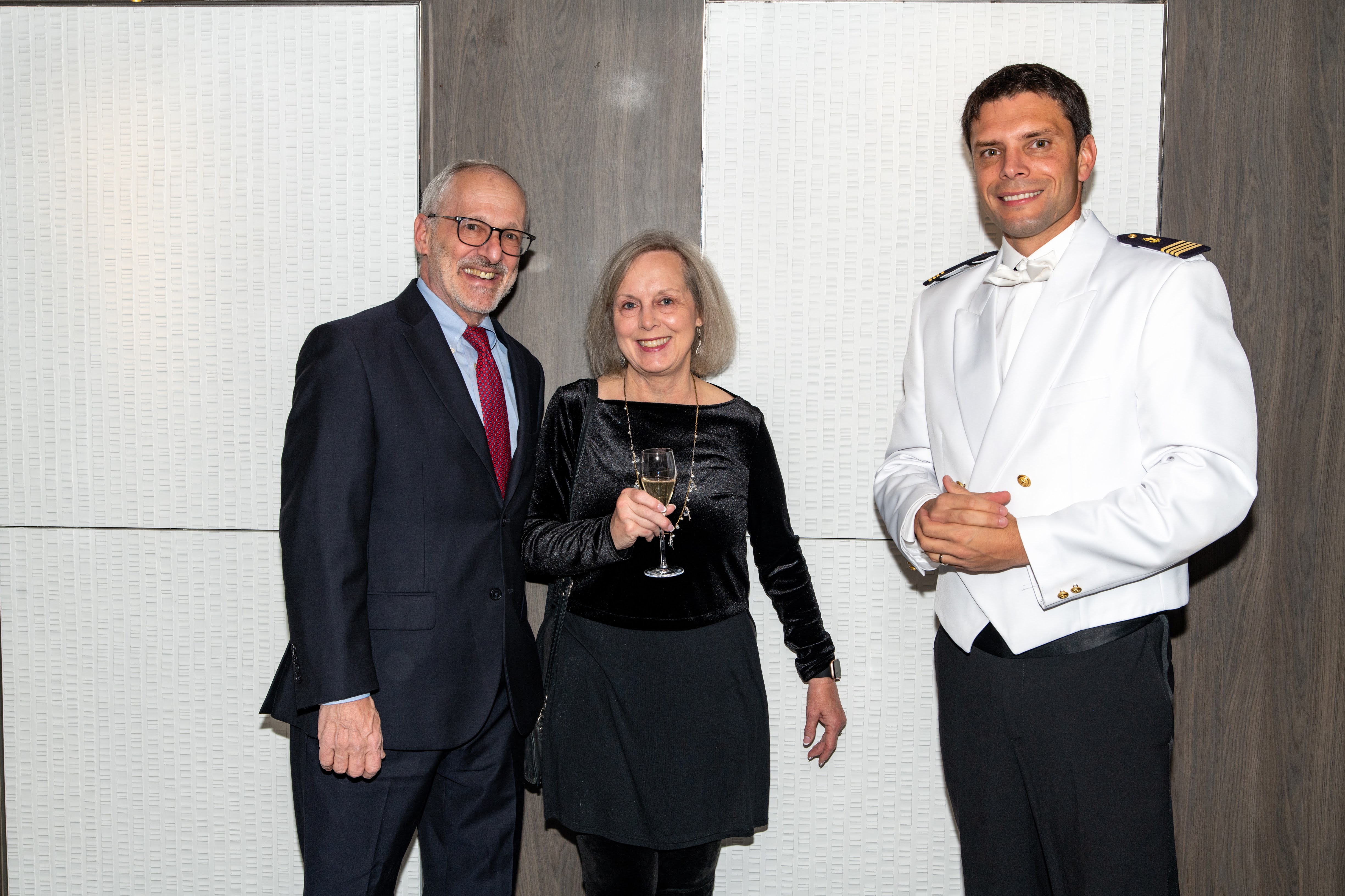 We had a busy day at sea on our way to the Falkland Islands: Got our parkas, our boots, a mandatory briefing on the dos and don’ts of venturing to these fragile environments, a wildlife lecture or two. Then the Captain’s Welcome reception and Gala dinner- Veuve Clicquot champagne, great food and wine. For gala dinners there is one menu (actually a regular and a vegetarian) and everyone is served at the same time in the main dining room. Quite a feat. Unfortunately the ship was rocking and rolling a bit and a lot of people were not feeling well. Most people got better with the motion (or got better drugs) as time went on and the inner ear adjusts. Neither of us suffered from the motion, which was fantastic, since the wave action got pretty intense later in the voyage. Photos of the gala evening below.