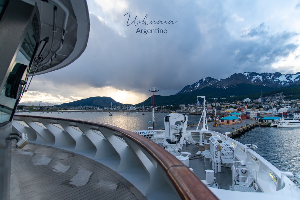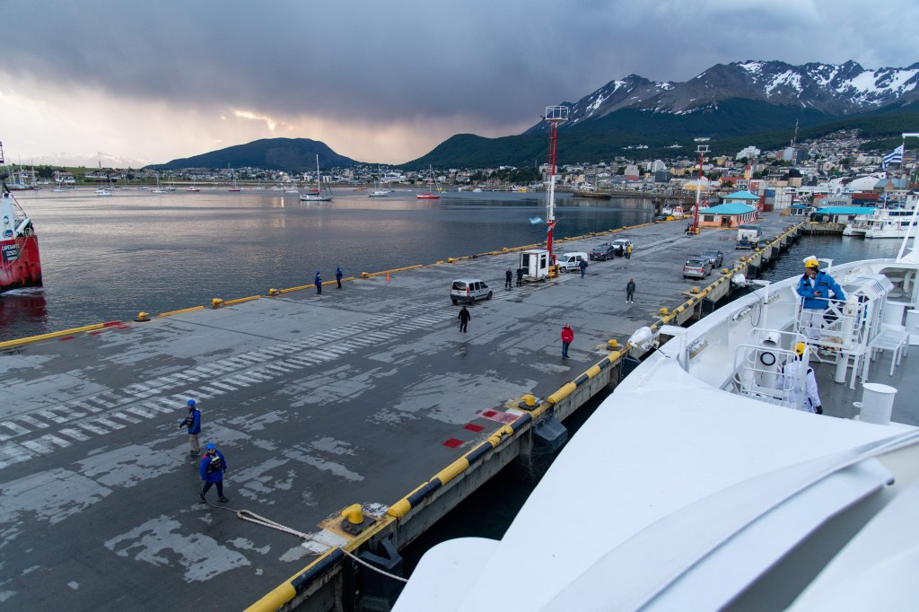 After the 3 hour flight we deplaned, wrestled our luggage where indicated and proceeded to besiege the various clipboard wielding folks adorned in Ponant insignia. Francais here- Anglais over there – National Park? Somehow we were sorted out of the airport and onto buses labeled with the language we spoke and where we were going. After a fair amount of clipboard checking and passenger wrangling we were on our way. Ushuaia, which claims to be the southernmost city in the world lies 1,900 south of Buenos Aries. This town of about 75,000 was once a penal colony, but the prison is now a museum and its primary industry tourism. Even in summer the surrounding mountains are covered in snow and we shiver a bit in the cool damp breeze.