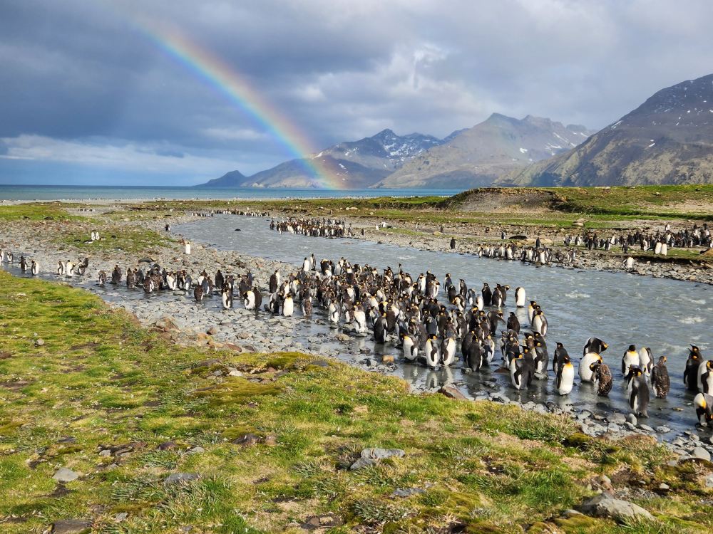 Back to nature… late that afternoon we landed in St Andrews Bay, home to the largest King Penguin colony on the island (300,000 or so), plus elephant and fur seals. As we wandered down the beach to a glacial river, then alongside it towards the glacier we were treated, to more penguins than we could count and a fantastic double rainbow over the ship. Spectacular.