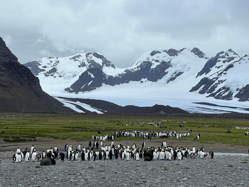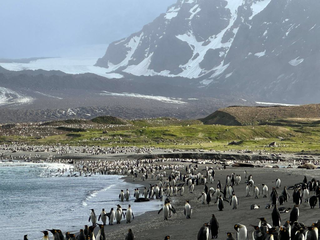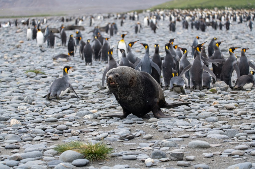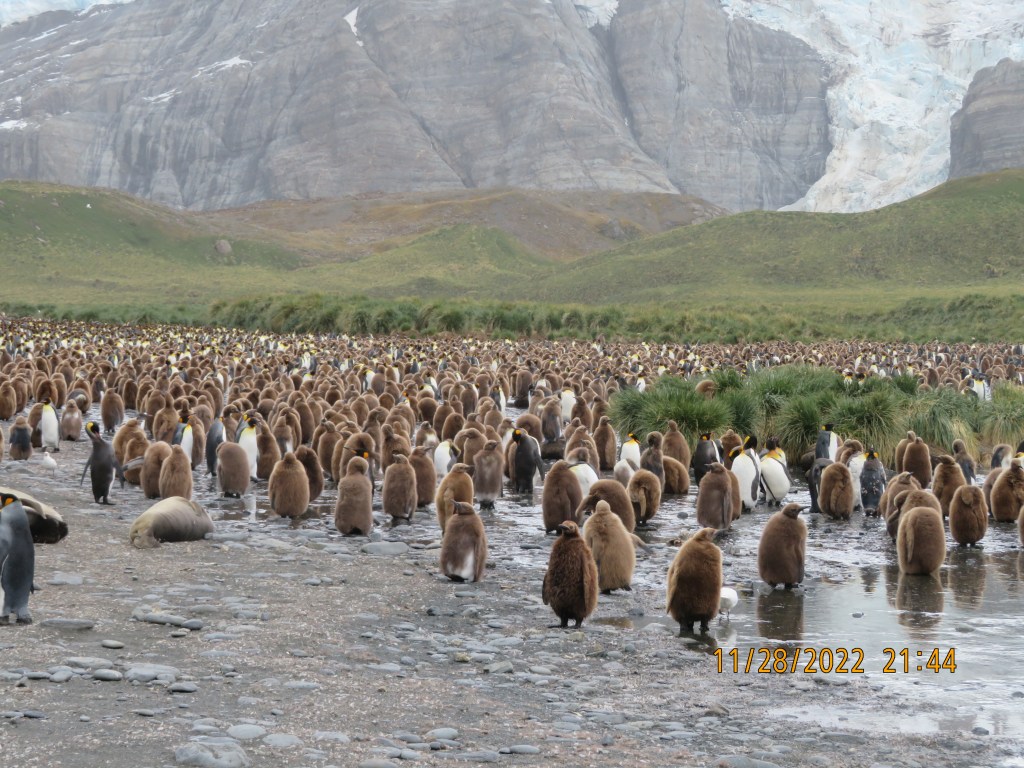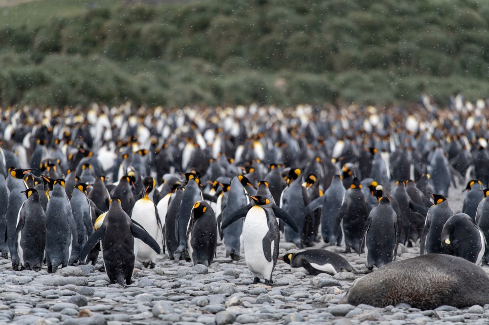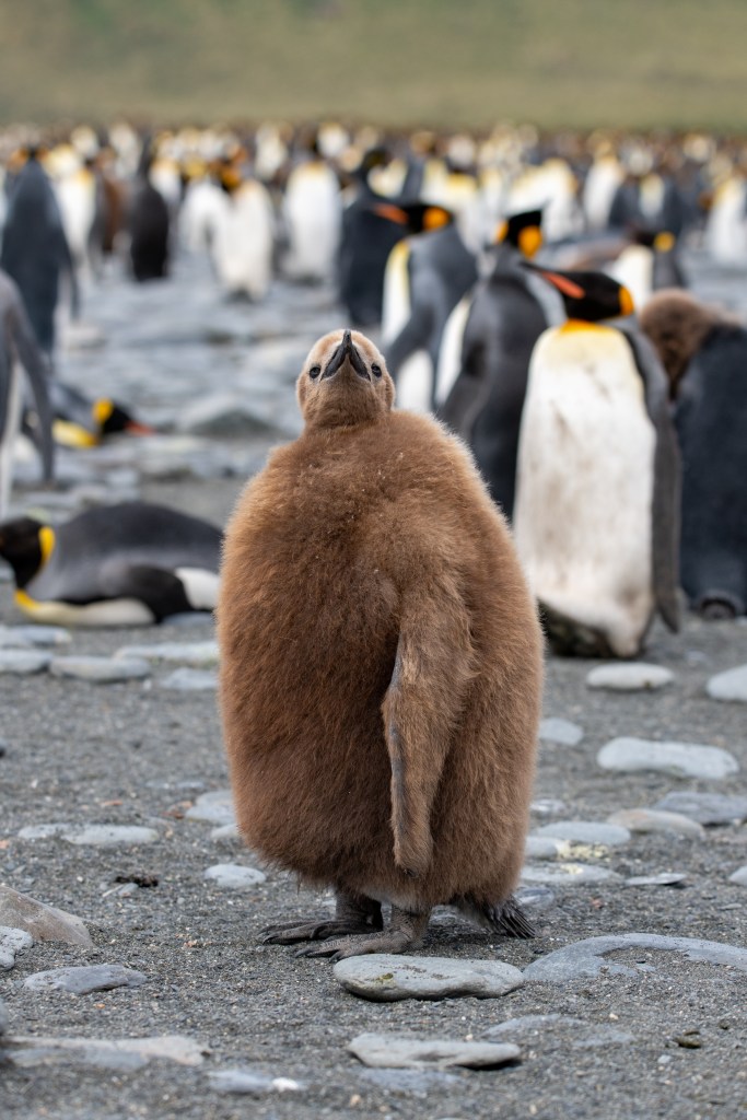 Our last stop on South Georgia was Gold Harbor, a beautiful bay surrounded by sharp peaks and glaciers on the southeast end of the island. There we were greeted by hoards of King Penguins, many molting their brown “baby feathers” in favor of their adult tuxedos.