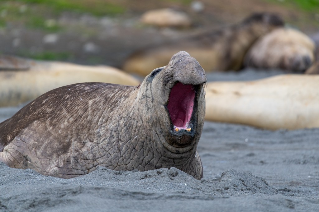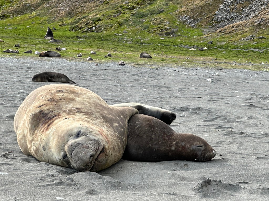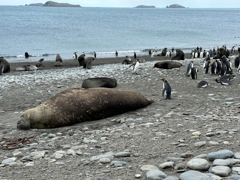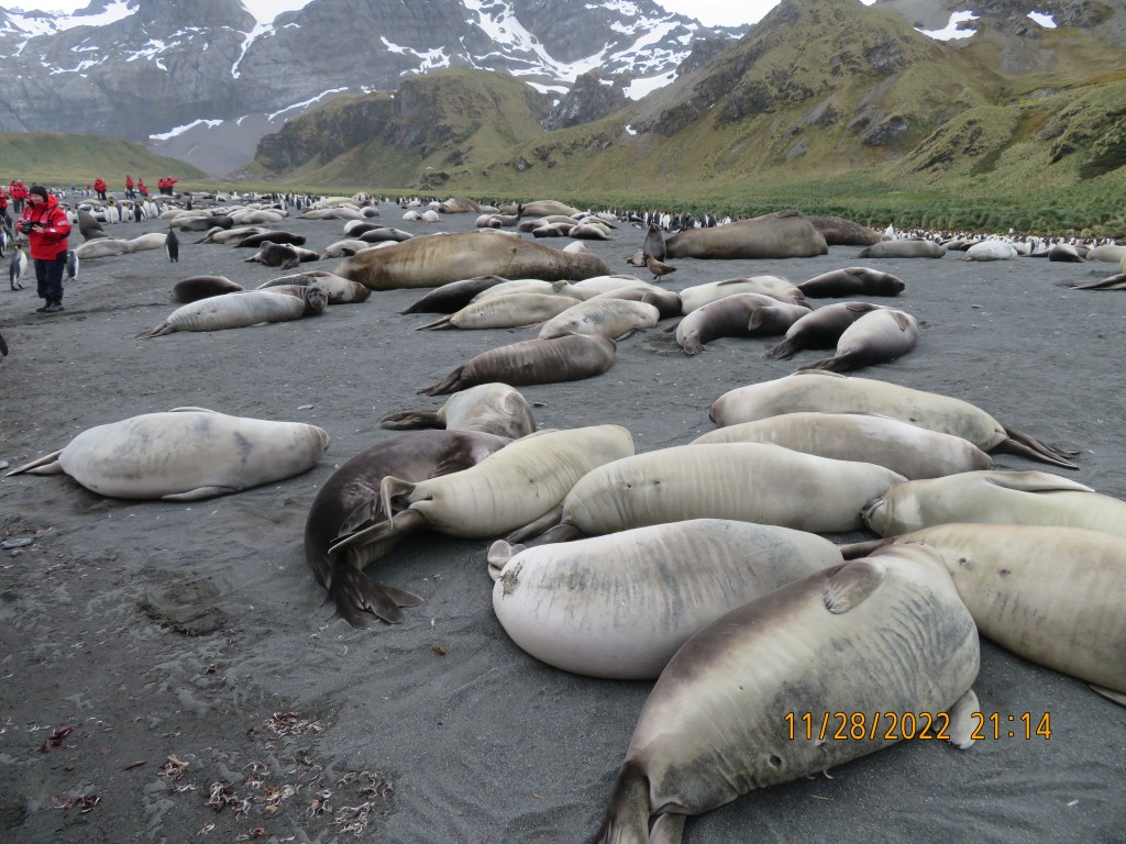 Our first landing was Salisbury Plain, the largest open “flat” spot on the island, home to the second largest king penguin colony on the island (only 200,000 or so), the largest elephant seal population, a bunch of fur seals and assorted sea birds. The naturalists reminded us on the rules of wildlife encounters as we got on the zodiac boats: they have the right of way, stay 15 feet away at all times, fur seals are grouchy and their bite is bad (really, wouldn’t have figured that out) but don’t run away from them, stand your ground and look big. Or hang out with a tall person, I’m 5 ft 1, that’s my strategy. All that goes out the window as our zodiac boat approaches the landing site. Fifteen feet? Animals cover every square inch we can see, with a few yellow and red jacketed humans to guide us on the path between. With no land-based predators, these animals have no fear of humans, on the contrary some are quite curious. You step out of the boat onto the beach to see the beautiful king penguins everywhere, elephant seals in clumps up the beach, clusters of fur seals, some with newborn pups, scattered around. It is absolutely overwhelming, breathtaking, mind bending. Words truly fail. We walk up the beach toward the main penguin colony, stopping or detouring to avoid aggressive looking fur seals. The wind is blowing a little cold snow in our faces, but the scene around us is so mind boggling that we just brush it off. We can’t get too close to the hundreds of thousands of nesting penguins up the mountain, but there are plenty making their way across the beach. We stand and watch them, smiling at the tiny fur seal pups and the napping elephant seals. Magic, awe inspiring, that’s all I or anyone else lucky enough to share the moment, can say.