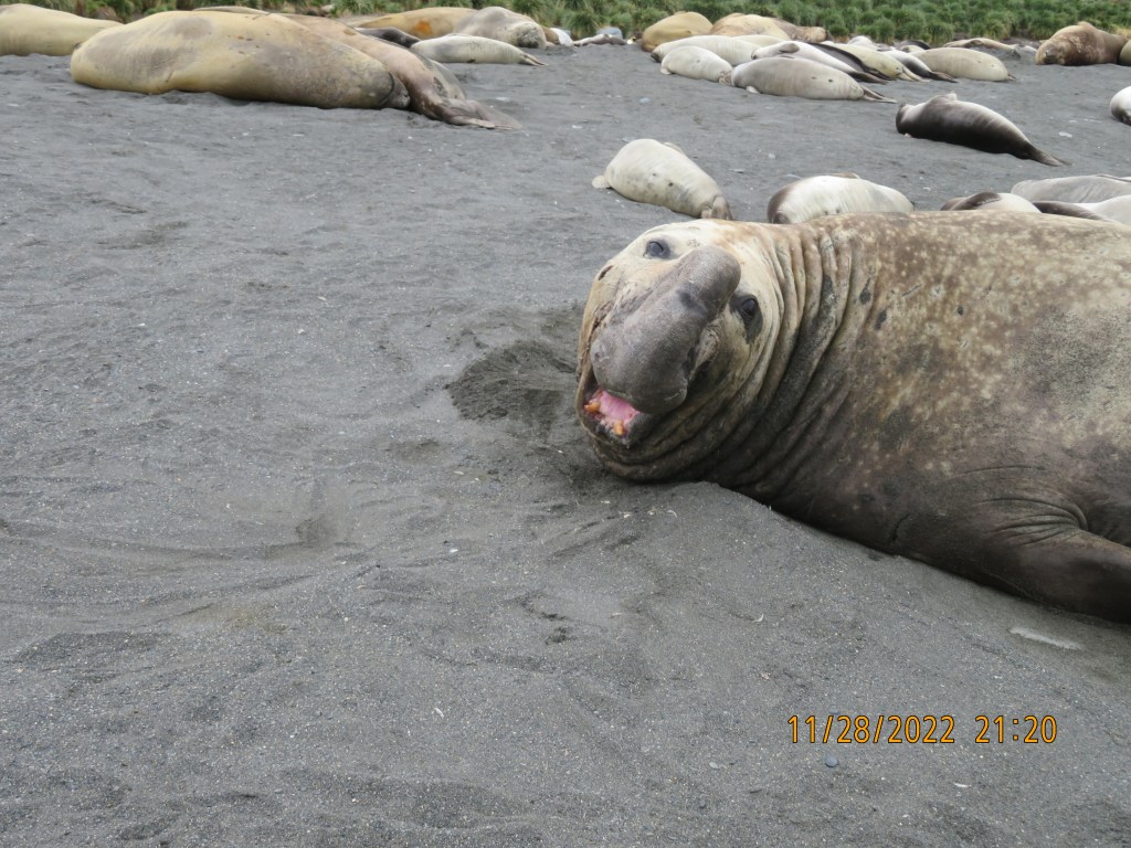 We also learned about the wildlife we would see and what they would be doing. Depending on when you go you will see different animals and observing different behaviors. It’s all about, as described by the delightfully funny naturalist Petra, “Sex on the Beach.” Are the giant beachmaster elephant seals working on attracting a harem, or are they exhausted from all that, ah, activity? Are the penguins building nests, sitting on eggs, feeding new chicks? Most animal behavior can be explained by breeding and feeding. I could comment, but I will let you think about that, maybe over lunch…. We also were warned to be careful both on shore and around the ship. Once leaving the Falkland islands there are no hospitals, no air strips. The ship has a doctor and nurse along with a medical unit equipped for basic stuff- if you need a few stitches, or trip and break your wrist, they can fix you up. But if someone gets hurt badly enough that they require care beyond those capabilities we all go back. So please don’t do stupid stuff. Okay then. The Viking Polaris incident was still in the future but provides an example of what can happen. One hand for you, one for the ship. In other words have one hand for the handrail at all times. It’s very sweet of you to bring coffee for your spouse, but if the ship rocks and you fall down the stairs because you aren’t holding the handrail and we all must go back to Ushuaia because you have a compound fracture, you will not be very popular. That got the point across, and yes, the ship can rock and roll that much.