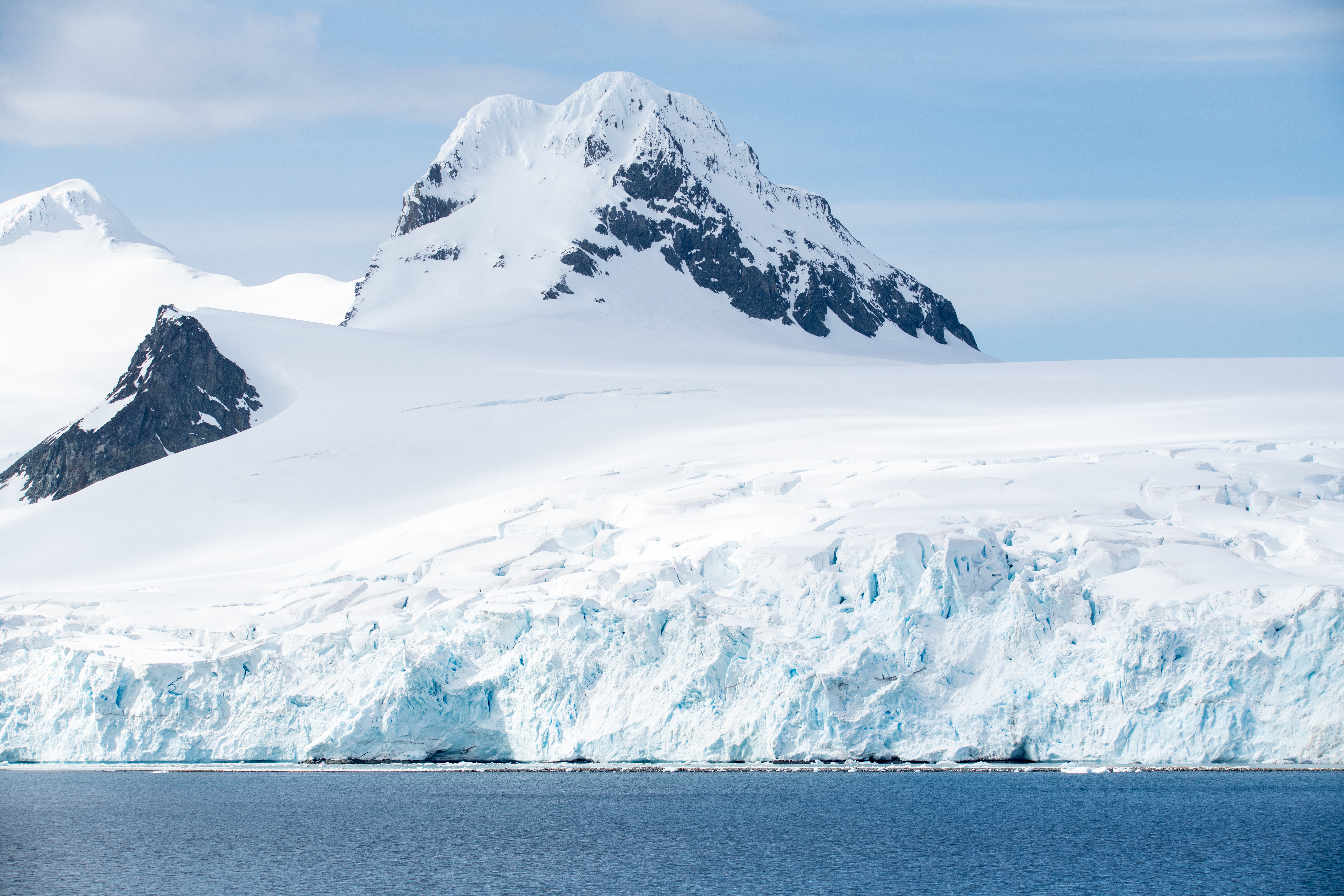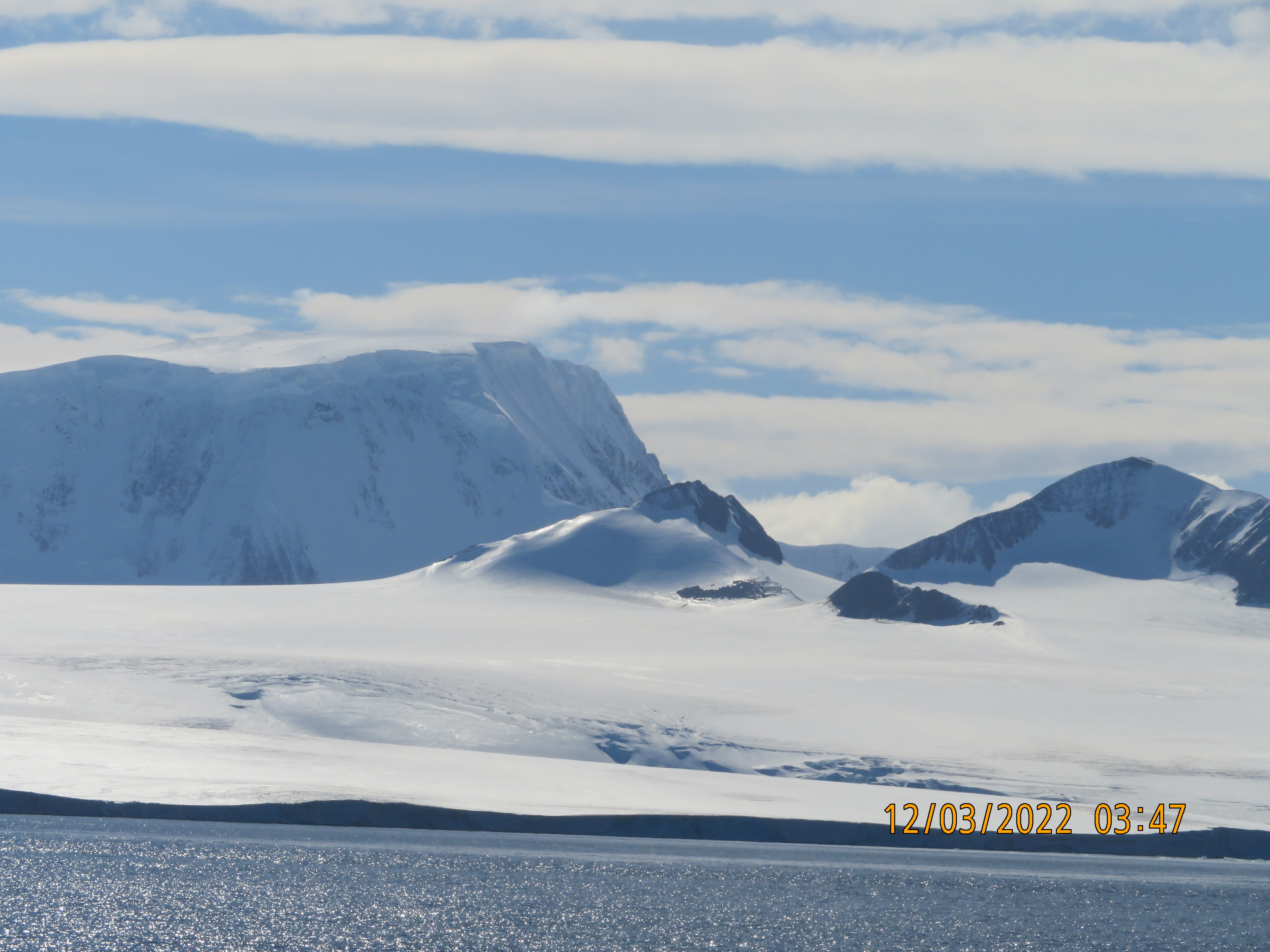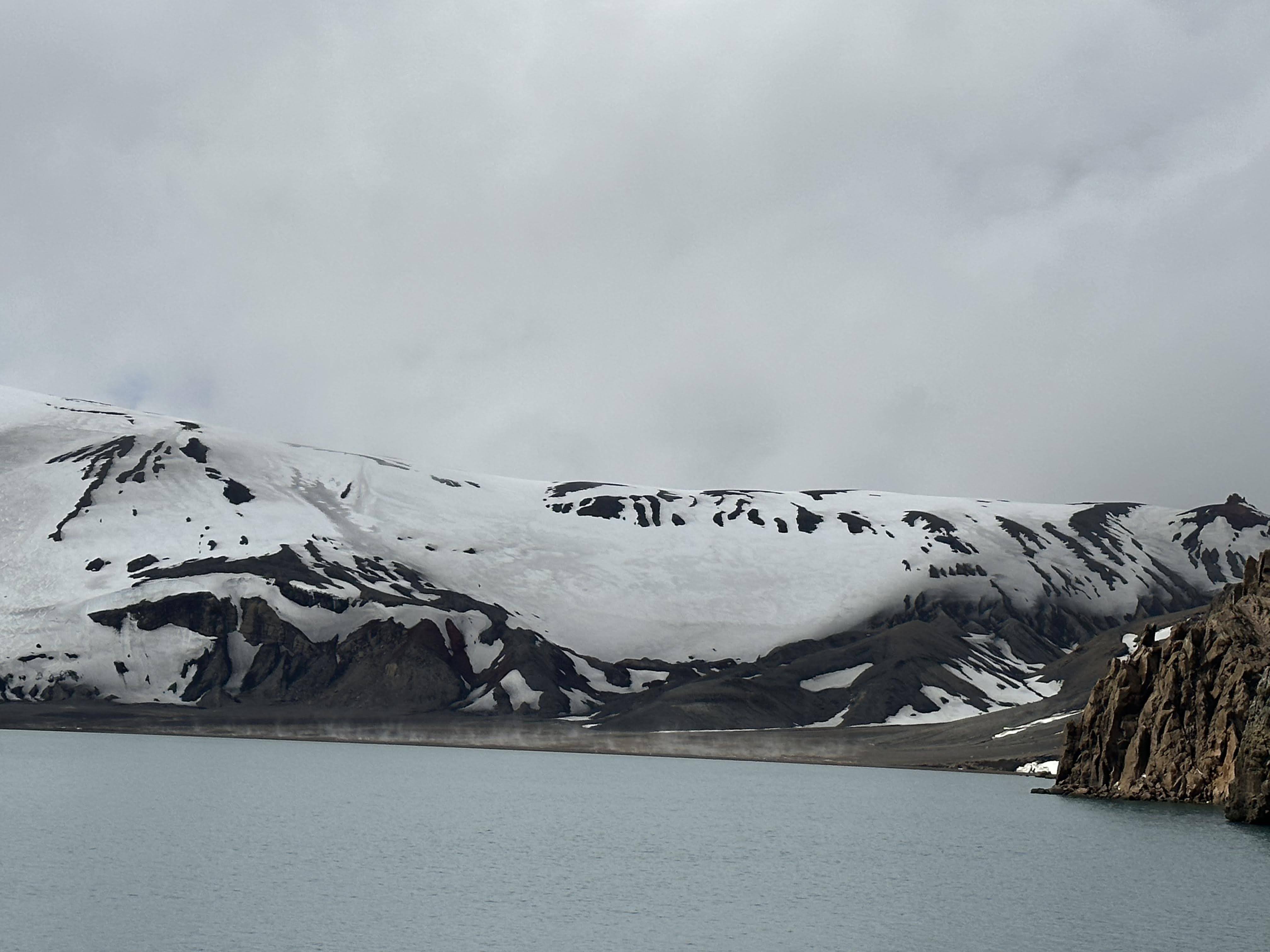 As we set sail from South Georgia Island we sailed in and out of Drygalski Fjord- a 7 mile long mile wide bay lined with hanging glaciers and stark rocky cliffs. The weather was cloudy and it was snowing lightly, we enjoyed the snow from our cabin stepping out onto the balcony occasionally to take pictures and listen to the sounds of the ship moving through light sea ice and the occasional bang of a calving glacier.