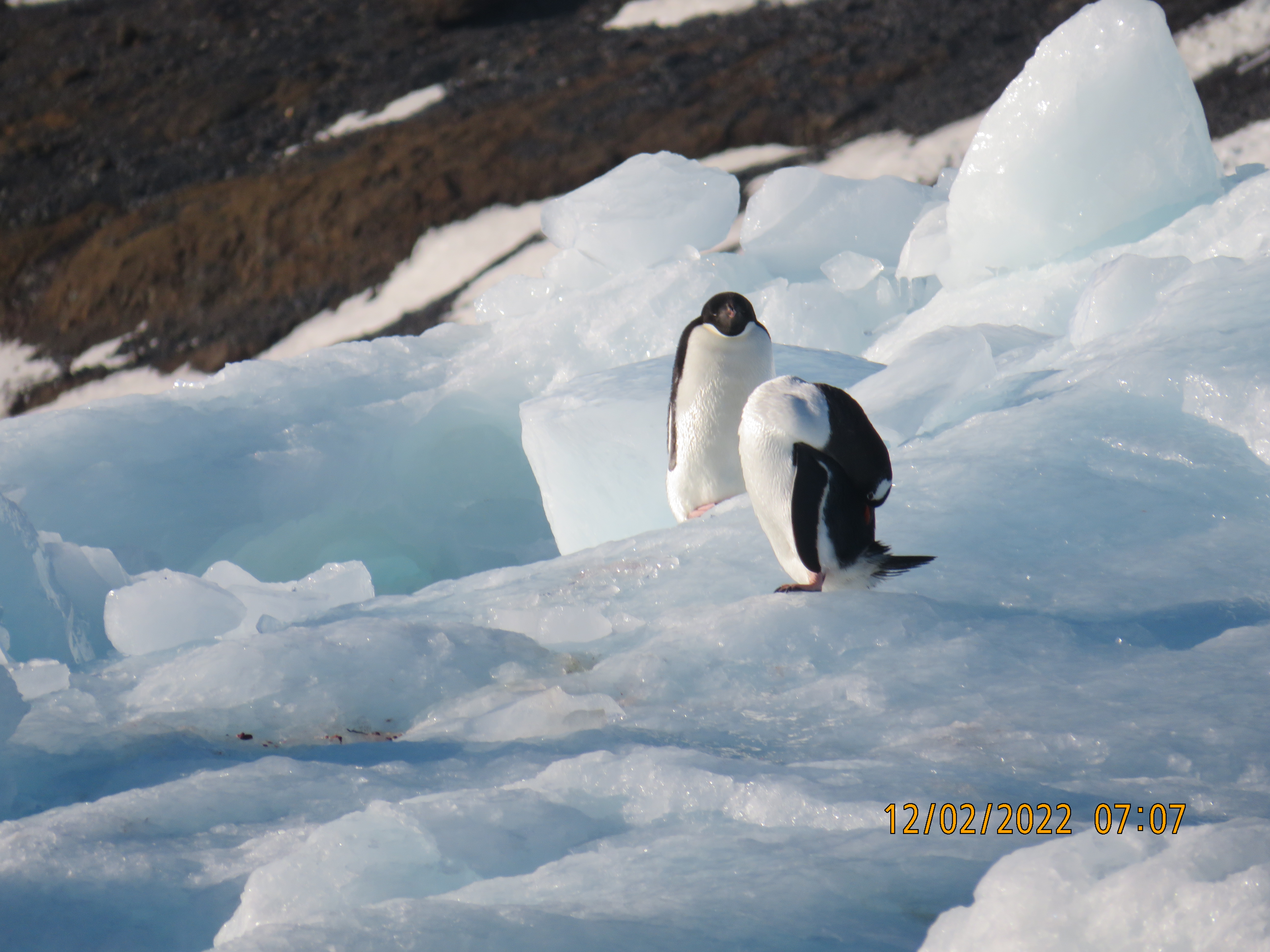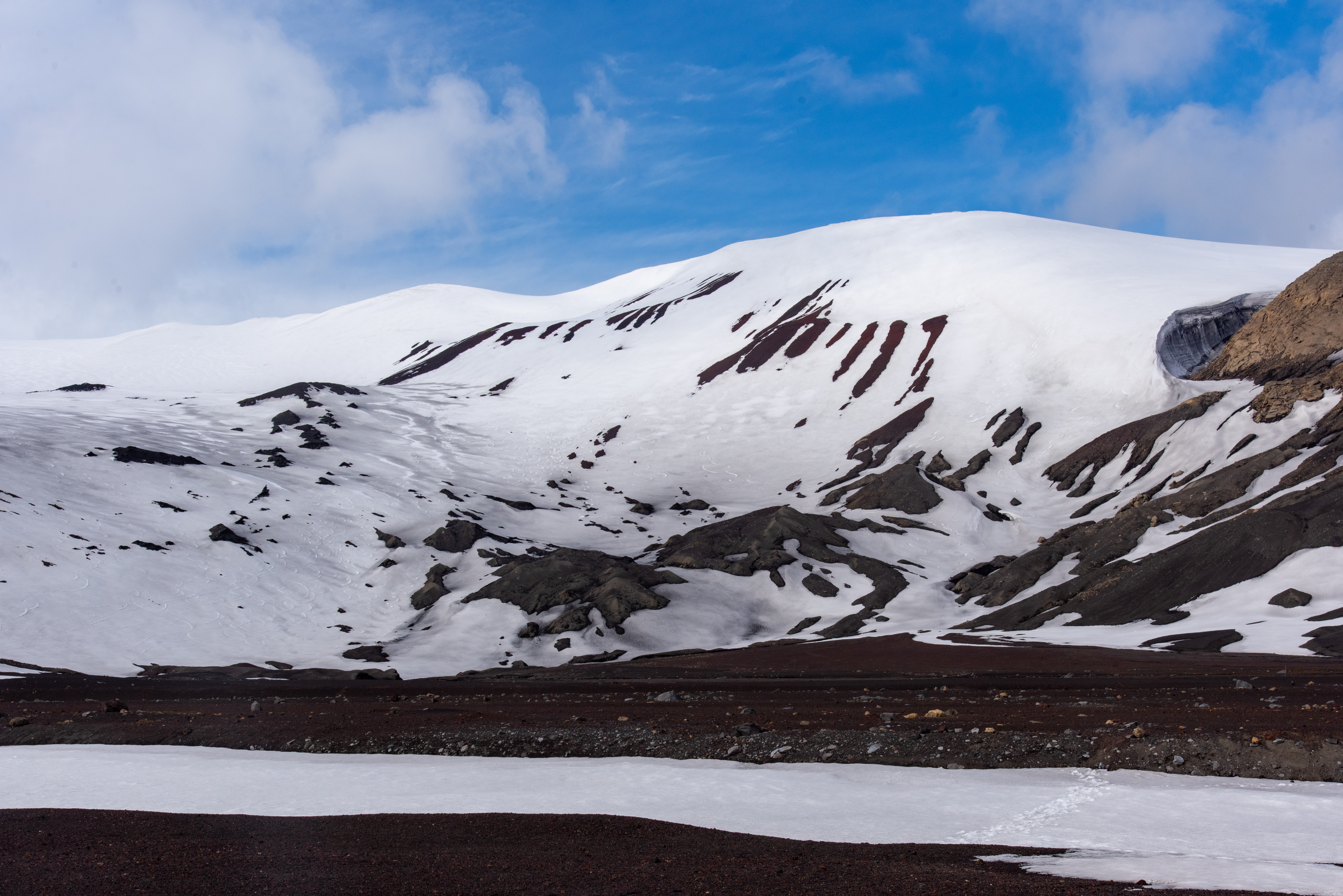 The captain and expedition leader decided to move on to Paulet Island where conditions seemed more amenable to a successful landing. Then back to Brown bluff where, finally we were able to step foot on the Continent of Antarctica. When you took at the photos notice the pristine whiteness of the snow on the mountains, and the drifts that fill the spaces between the peaks. Don’t know what it looks like later in the season, but in early December it was spectacularly beautiful.