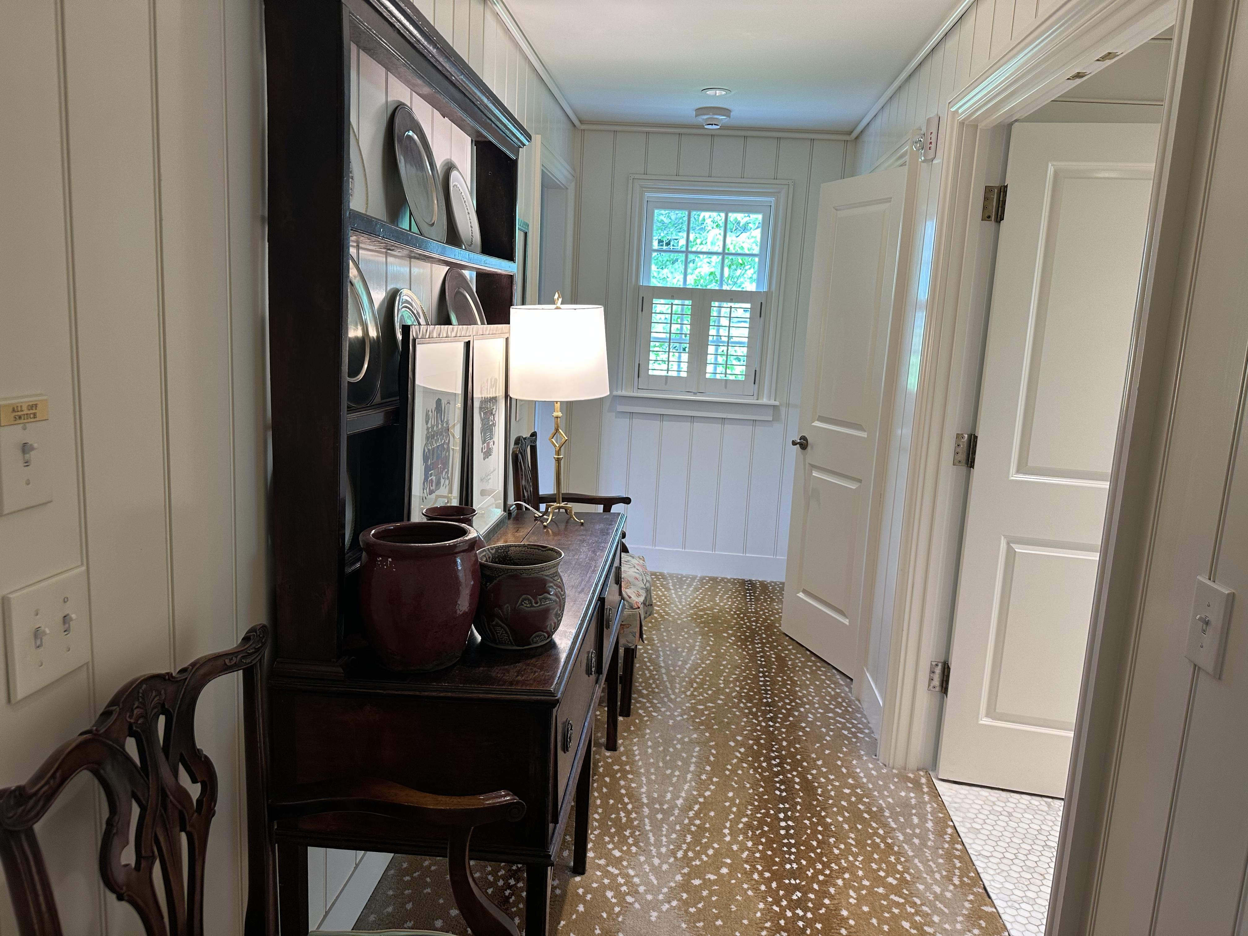 When you arrive for your stay, the staff will unload your car and whisk it away until you leave the property. After checking you in a staff member will load you and your luggage into a golf cart, give you a brief tour and show you to your room, suite or whatever. We stayed in the guest cottage, next to the main house. You call 0 for anything you need: a ride to the barn for dinner (it is a good distance from the main house) for instance. Our room had a lovely view, a huge bathroom, two very large closets and lovely furnishings (shown below) We took a walk down to the lake and checked out the fly-fishing shack and the Yallarhammer Pavilion. A storm was brewing, but we made it back to our cottage before it hit. Then it was off in a Lexus to the Barn for dinner.