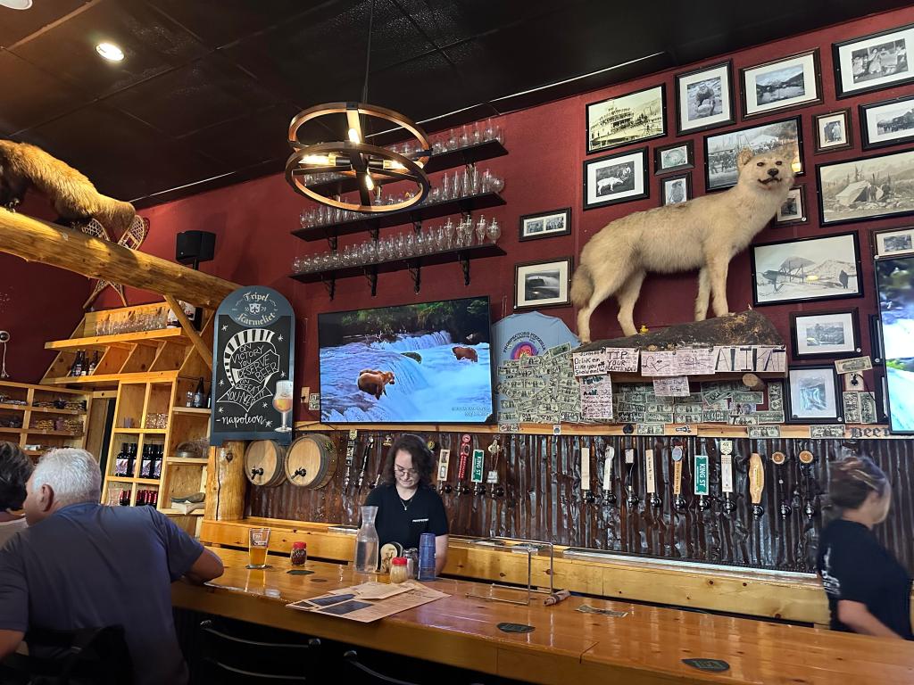One night we went to 49th State Brewing, 11 miles up the road in Healy. In high season be prepared for a wait (for us 45 minutes), but you can hang out in the courtyard with one of their beverages and a variety of yar Food was good, Alaska focused ingredients- fresh Halibut, salmon and of course their world famous Yak Burger. That’s what the menu said, Rob had it, it was fine.
