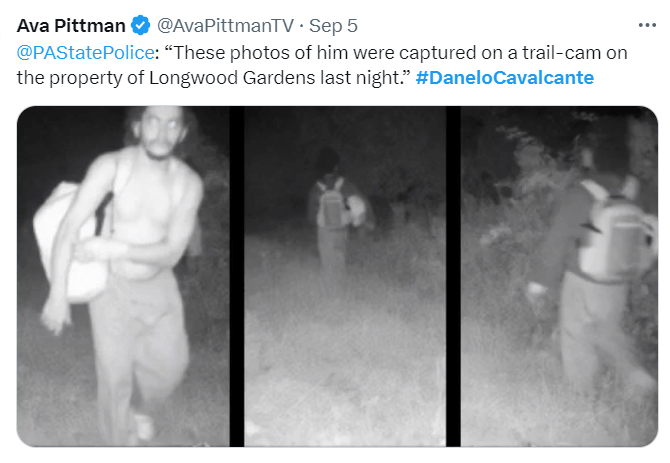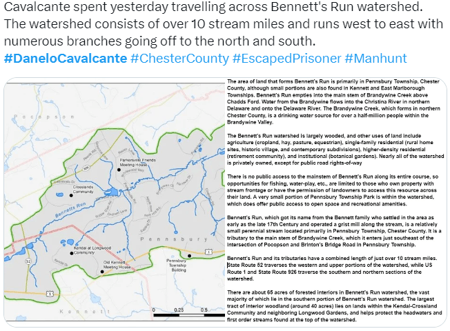 Nights where the helicopters sound like they are about to land on the lawn, days where police and helicopters broadcast a recording from his mother begging him to surrender. Seven days of rapidly evolving search zones, roadblocks, and police perimeters. The police believed they had him contained within a two-mile perimeter, then he popped up on a trail camera on the property of Longwood Gardens which is outside of that.